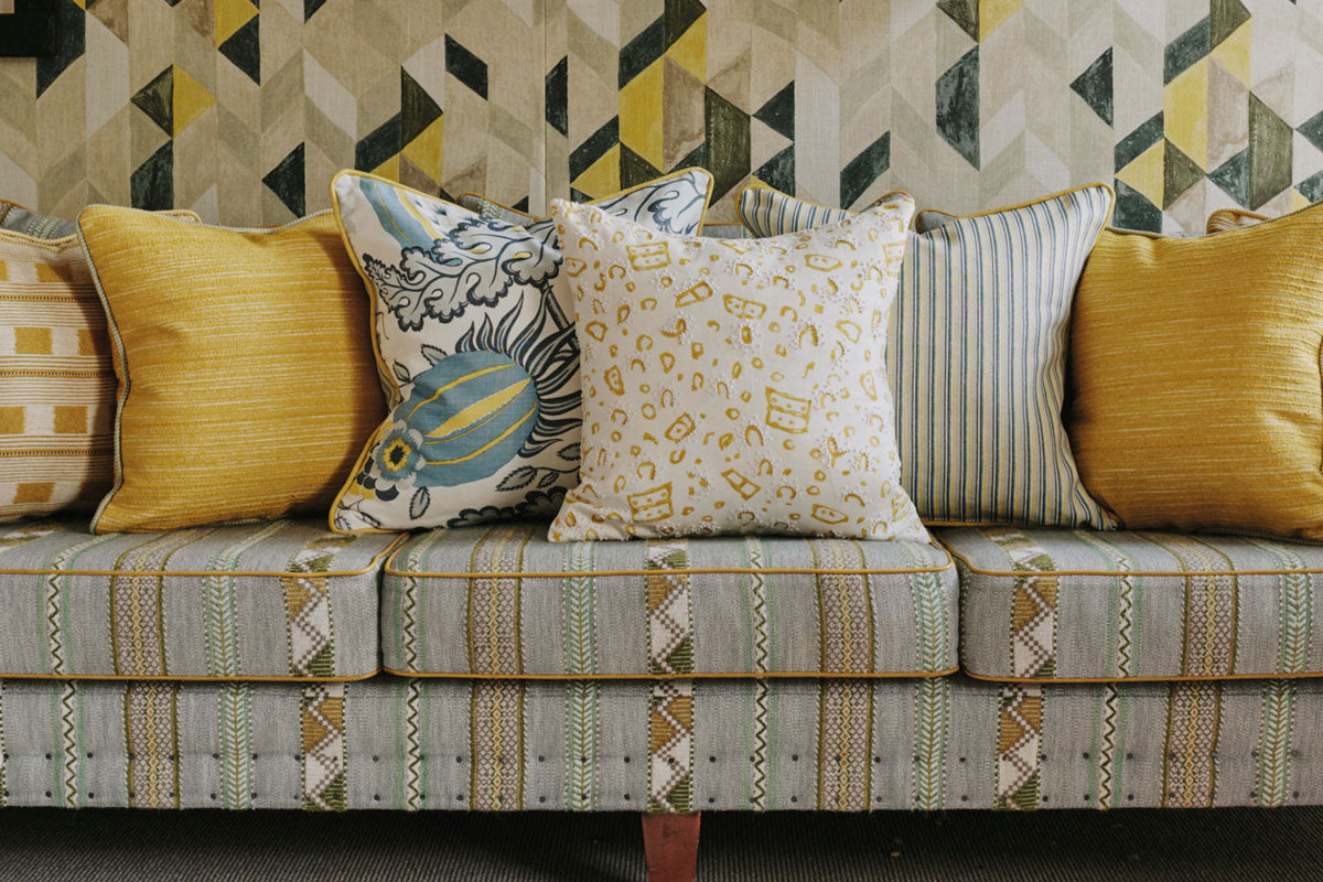 Our best-selling 'Carnival' botanical print from the archives of Michael Szell, combined with the 'Peace & Love' colourful stripe by Kit Kemp, finished with a smart yellow trim. Material: 100% Linen