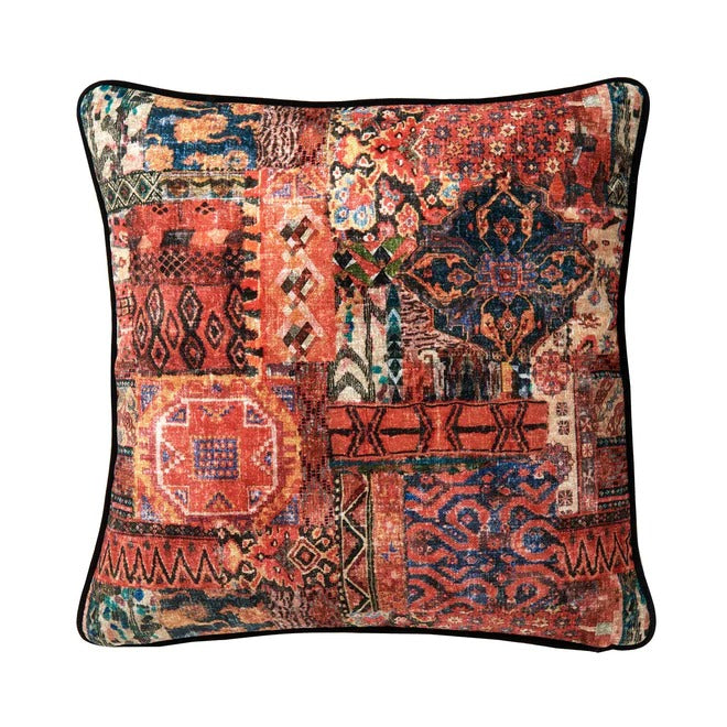 For those who tastes are more classic in flavour, this velvet cushion has an interesting patchwork design based on different carpets from around the world. Vibrant and warm in tone, it's backed and piped in bold Onyx Omega velvet. The cushion is filled with the finest sourced duck feather and down.