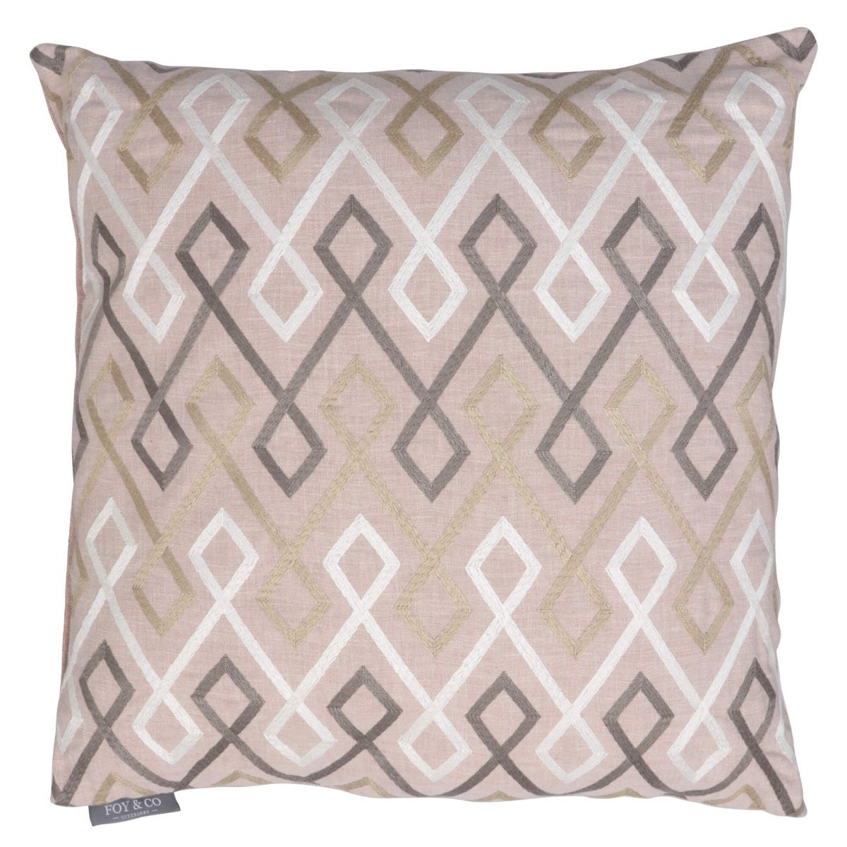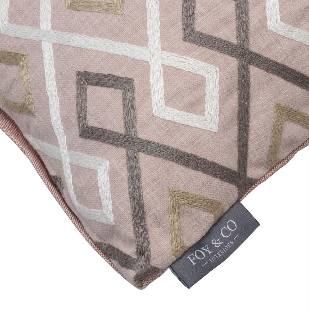 Expertly handmade by Foy & Co, our Florence cushions feature a striking embroidered three tone pattern against a blush pink background. The cushion is finished with a complimentary plain reverse fabric.