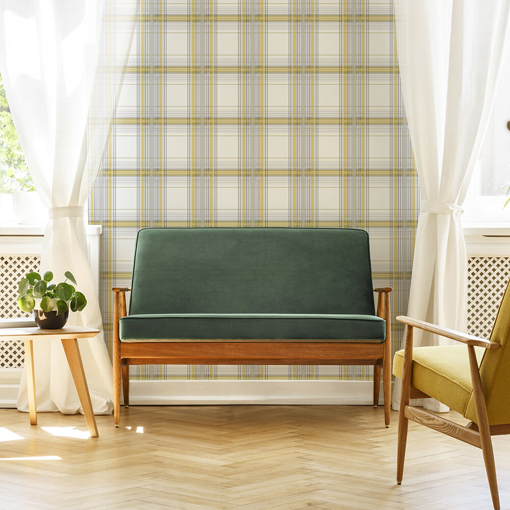 A contemporary tartan check design, with subtle metallic accents throughout.