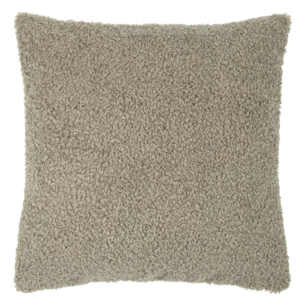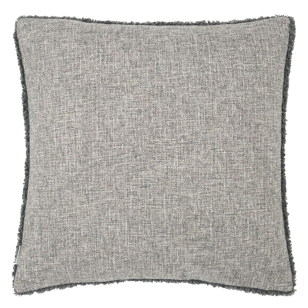 An incredibly soft and fluffy faux sheepskin cushion in graphite is paired with the tweed texture of Skipton in stone. This stylish large square cushion adds depth and texture to your home.