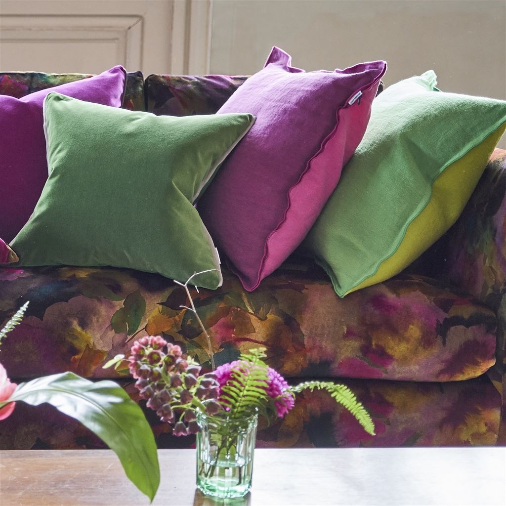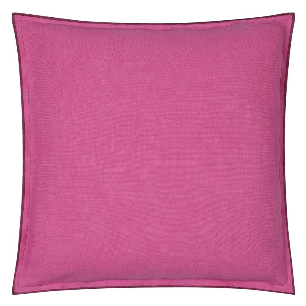Add a vibrant splash of colour to your interior scheme with this linen rich plain cushion in peony reversing to berry. With a textured weave and large square size, two tones are reinforced together with a smart overlocked edge detail. All our cushions come with a luxurious feather pad.