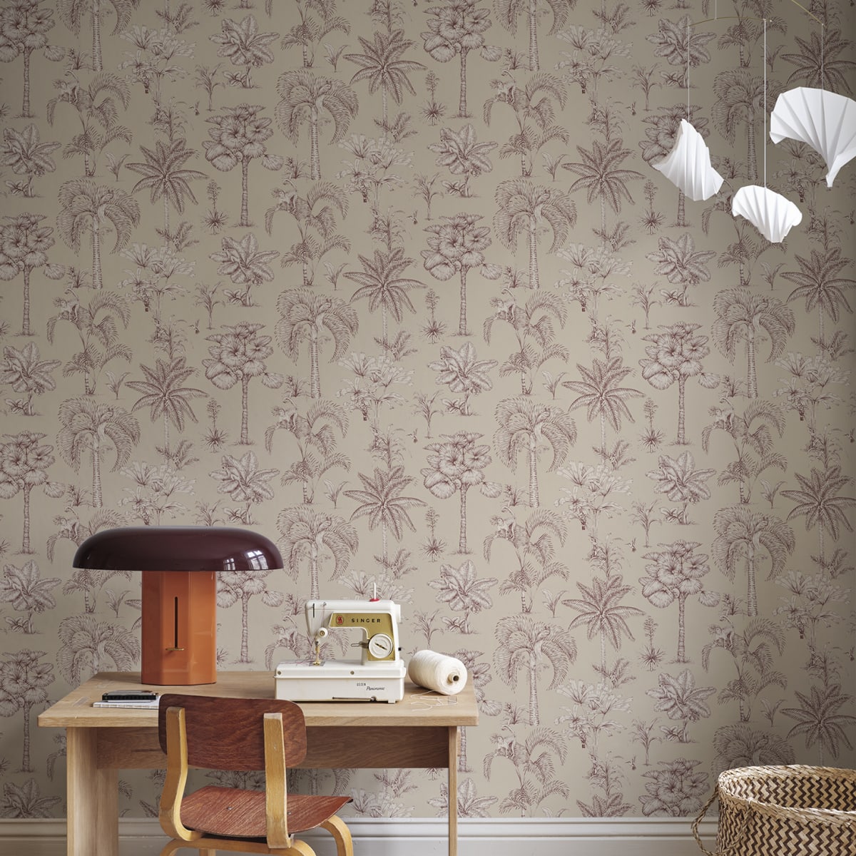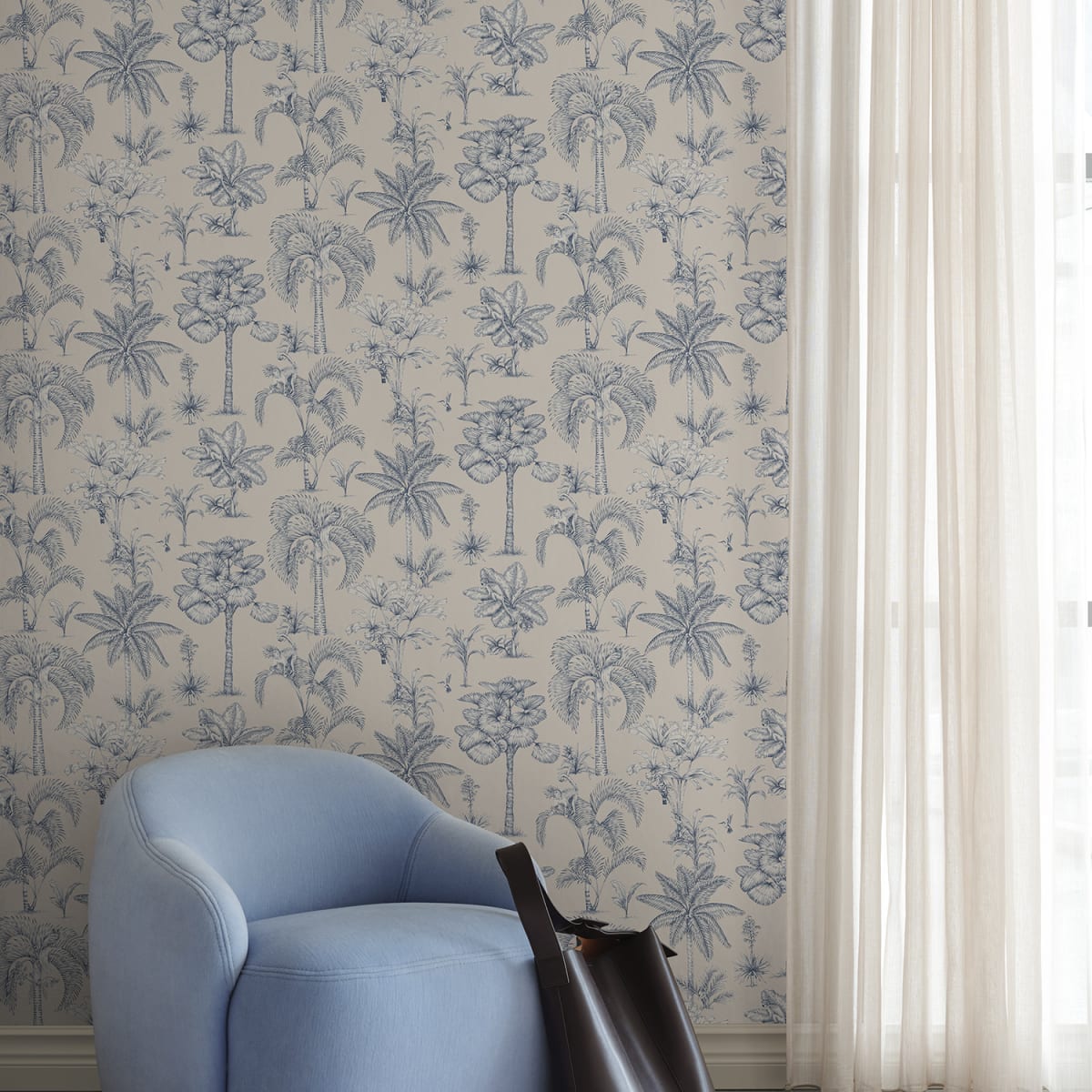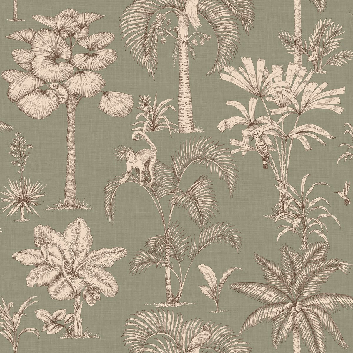 Discover the enchanting jungle kingdom with our Adele wallpaper. Intricate palm drawings combine with hidden exotic animals to create a mesmerizing tableau that captivates both young and old. Its toile-inspired elegance hues adds a sophisticated yet playful touch to any room, inviting exploration and wonder.