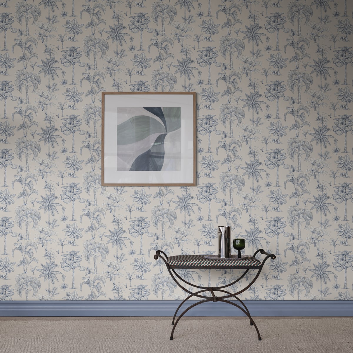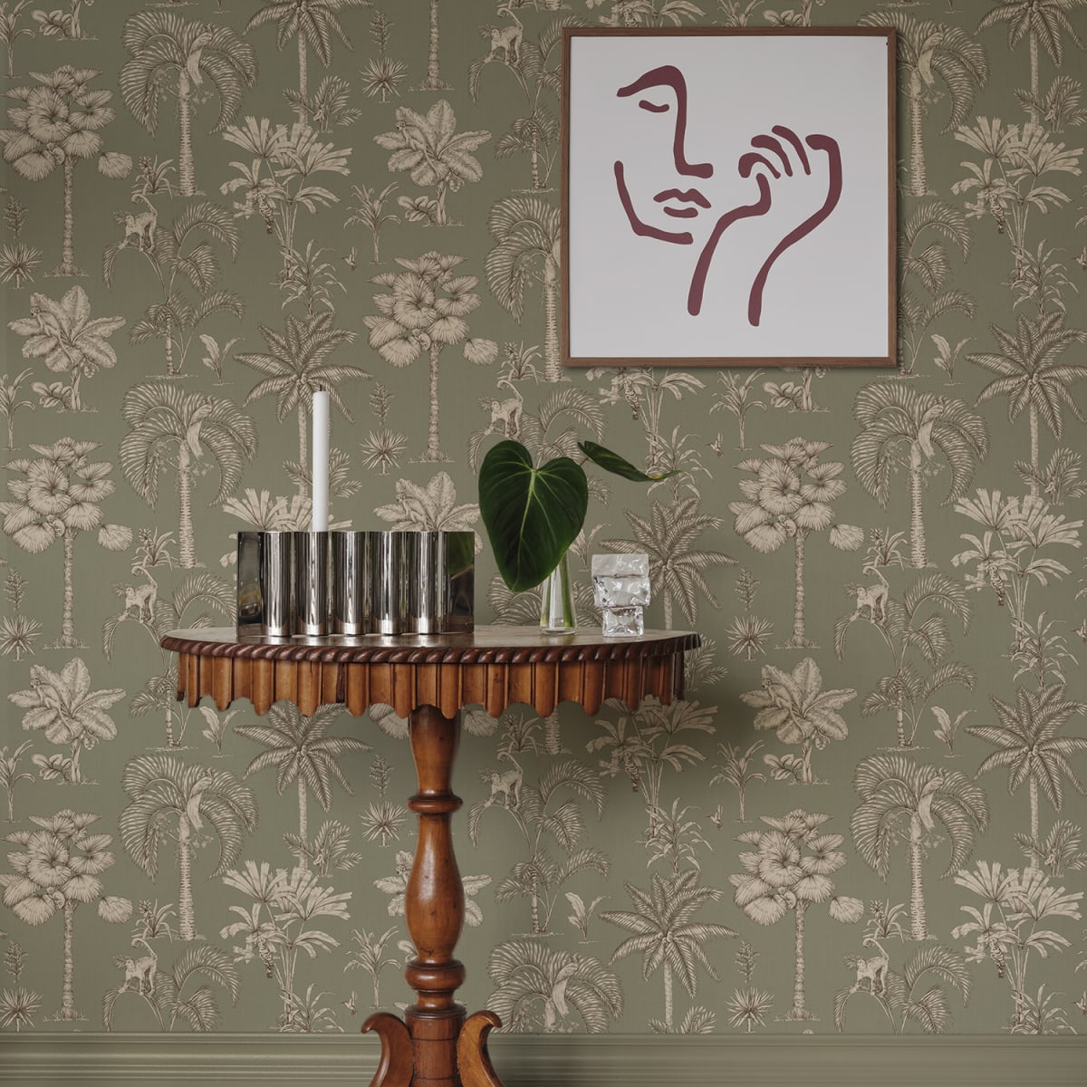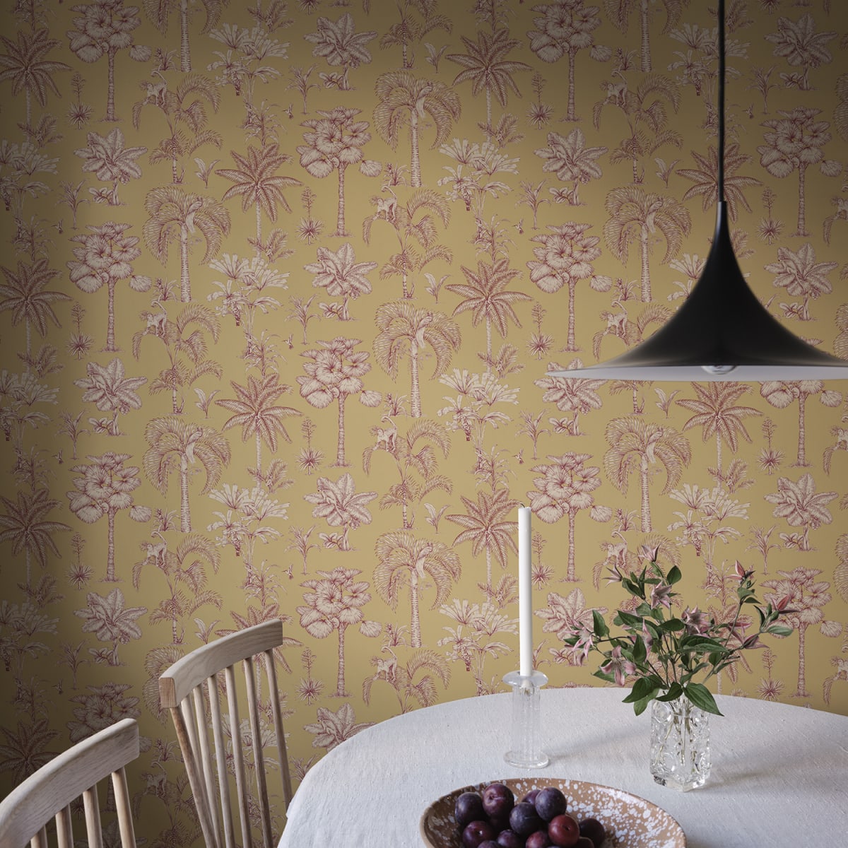 Discover the enchanting jungle kingdom with our Adele wallpaper. Intricate palm drawings combine with hidden exotic animals to create a mesmerizing tableau that captivates both young and old. Its toile-inspired elegance hues adds a sophisticated yet playful touch to any room, inviting exploration and wonder.