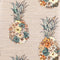 Stylised pineapples composed of flowers with colourful petals are set on a background resembling grass cloth.