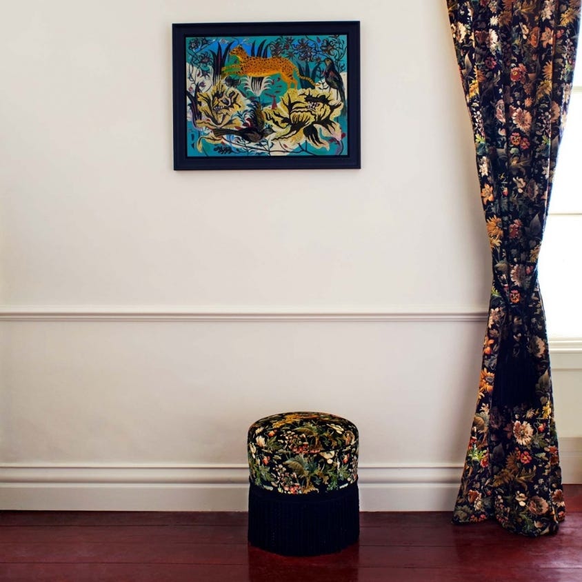 Wild sunflowers, poppies, daisies and lilies trail across AVALON – a remastered archive print named after the mythical isle in the tales of King Arthur. This hand-drawn motif unfurls with a rich depth and detail that draws you in, whether cloaking curtains or furniture.