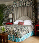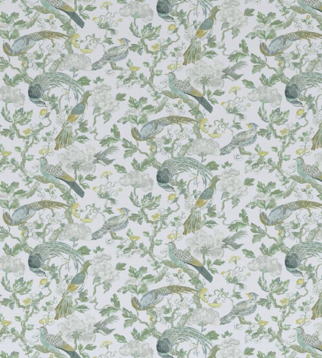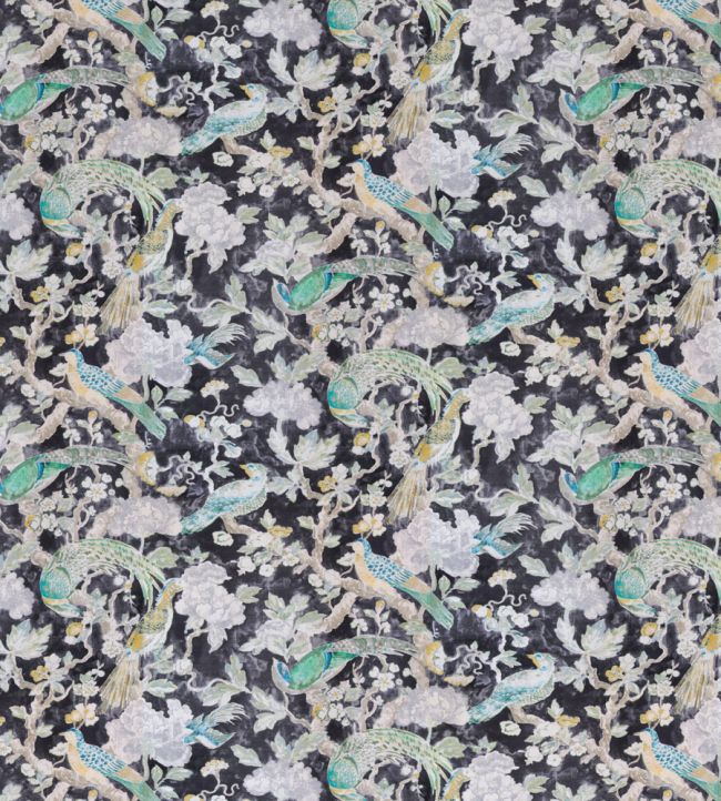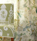 In the style of hand-painted Oriental wallpapers, many of the elements of this design were taken from a lacquered Japanese screen. Printed on a glazed chintzed linen union.