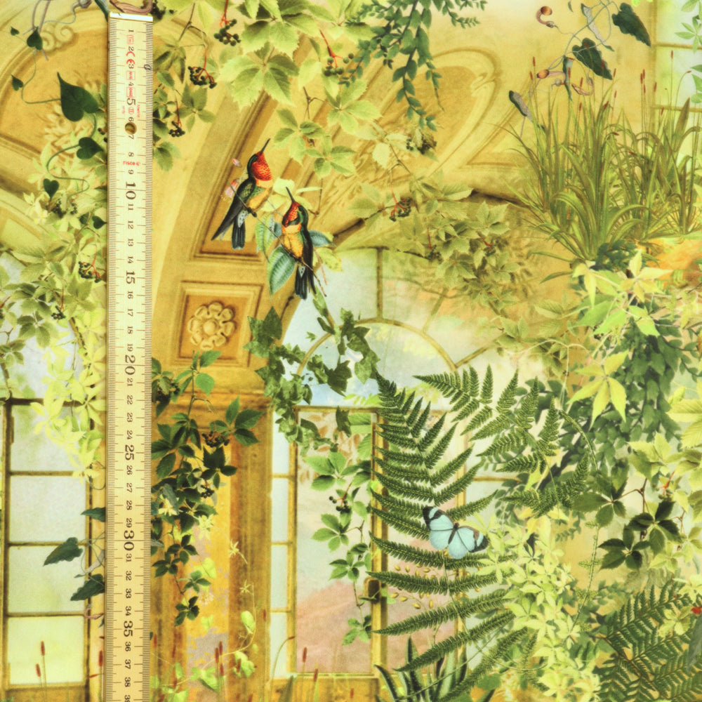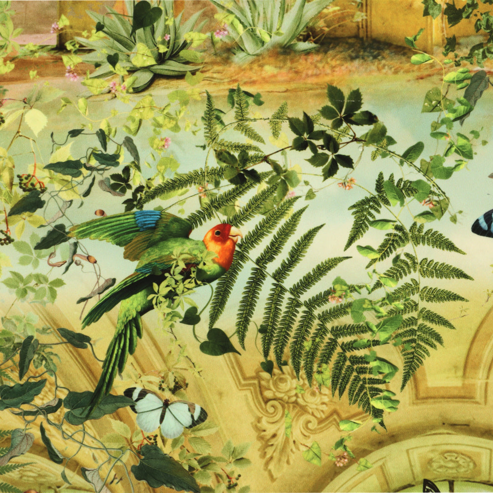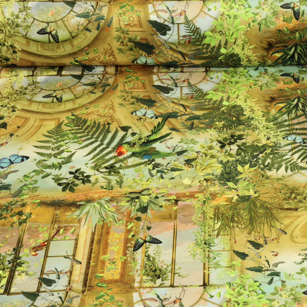Palatial buildings succumb to nature in Aviary Velvet fabric. Birds and butterflies fly amongst the lush green overgrowth as it envelopes its grand back drop, digitally printed in exquisite detailing. A soft velvet, Aviary will make a real feature in any room, suitable for use as curtains, blinds, cushions and upholstery.