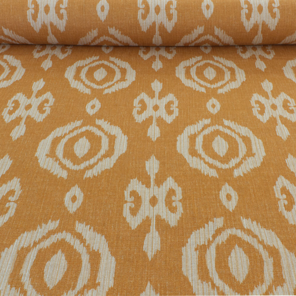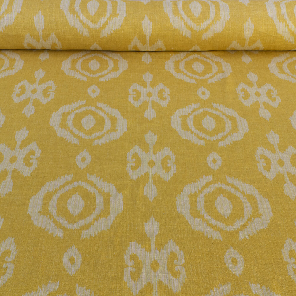 A bold, yet elegant ikat style design, Bali Ikat is a wonderful vibrant fabric full of fun. It has a distinct tribal pattern which is sure to make a statement feature in your home. Printed in a vibrant mustard yellow colourway on a soft viscose \ linen blend fabric, Bali Ikat fabric has a lovely softness that will bring a welcoming warmth to soft furnishings, curtains and blinds. Its large pattern repeat will look particularly impactful on upholstery pieces such as sofas, chairs, footstools and headboards.