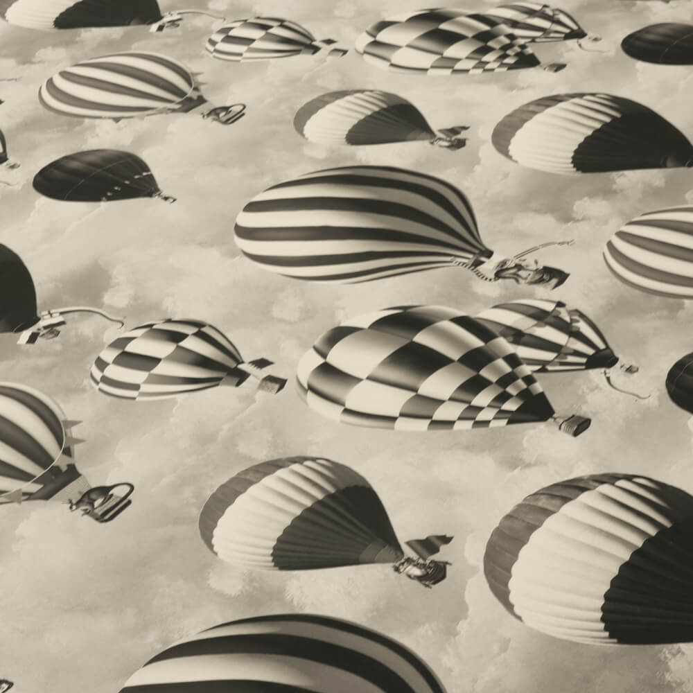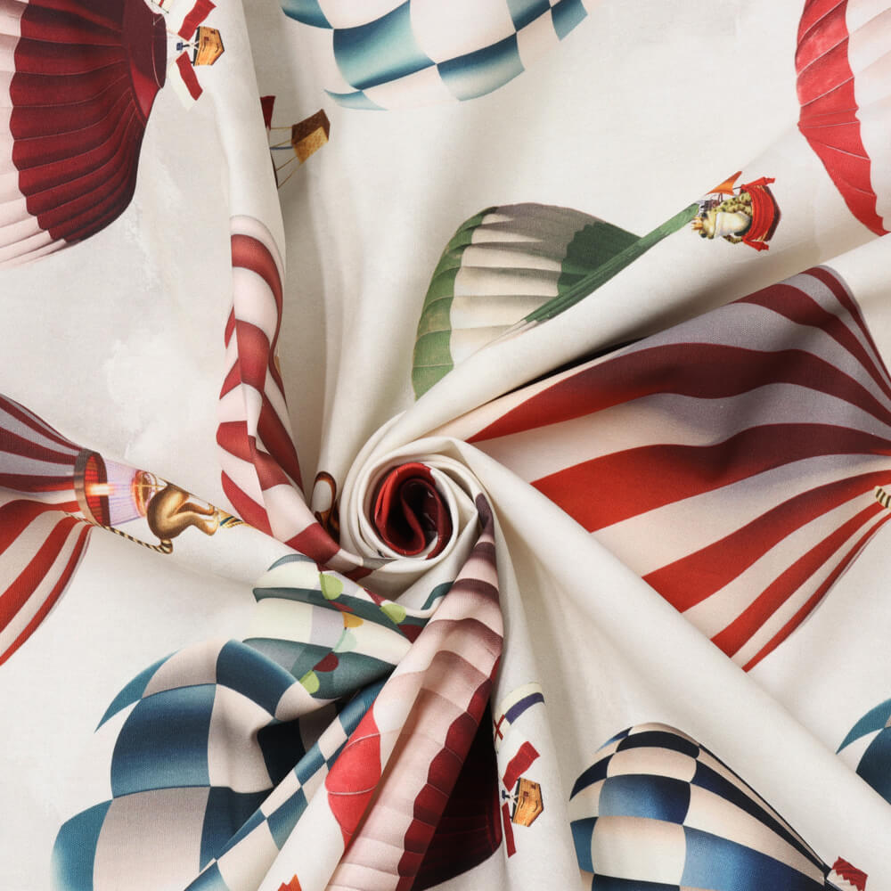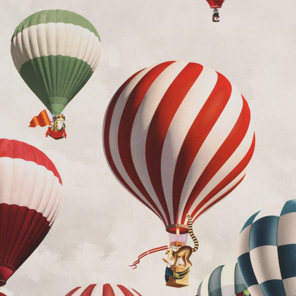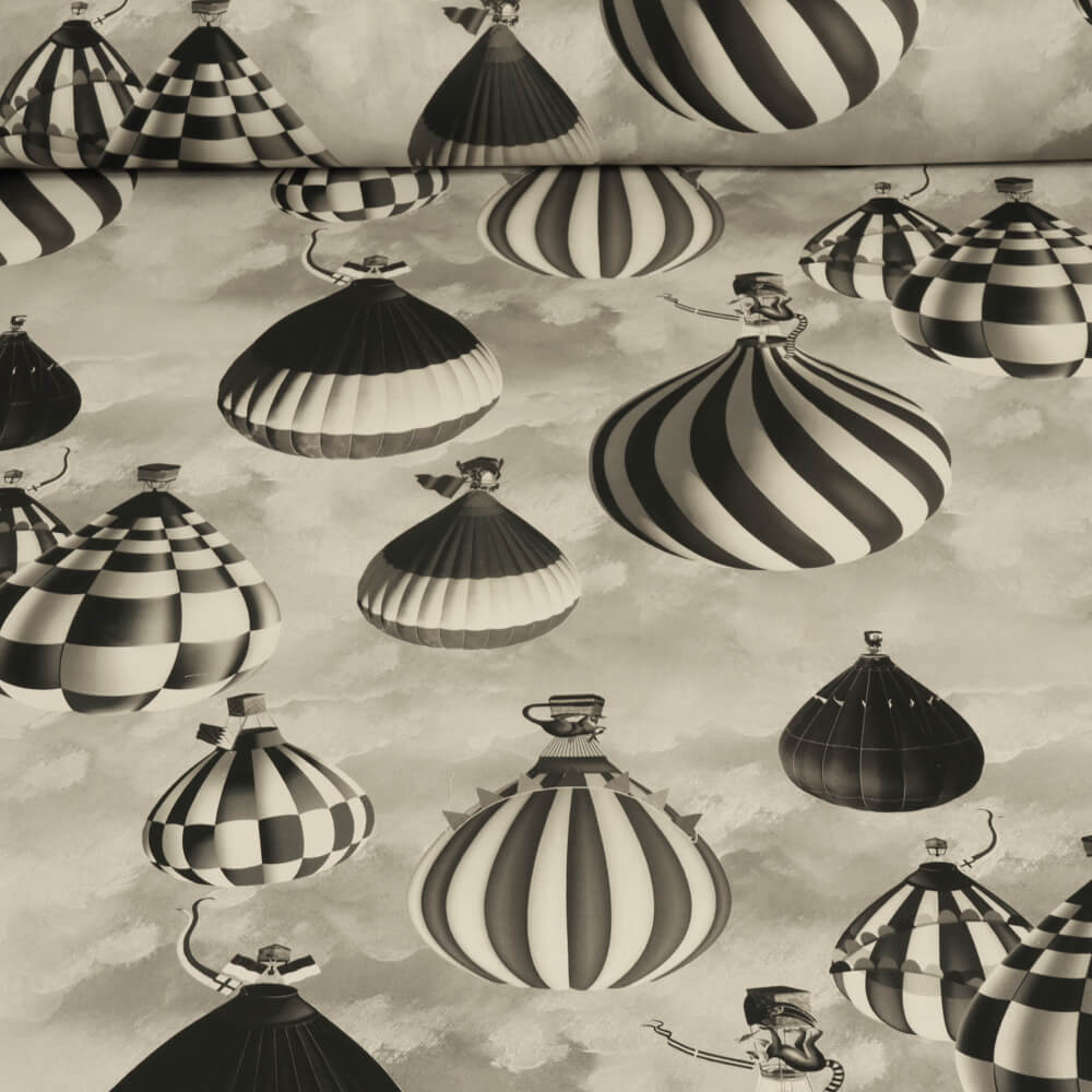 A fun, whimsical fabric where the sky is filled with hot air balloons piloted by some furry friends. Balloon Fiesta fabric has a quirky charm, its large pattern repeat making it ideal for large curtains and blinds. Balloon Fiesta is suitable for cushions, blinds, curtains, soft furnishings and upholstery. A fun option for children's rooms and nurseries.
