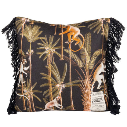 A tropical style design featuring impressive palm tree and various monkey illustrations on black background. Filling: Duck feather, Composition: 100% Linen, Finishing: Black fringes on two sides