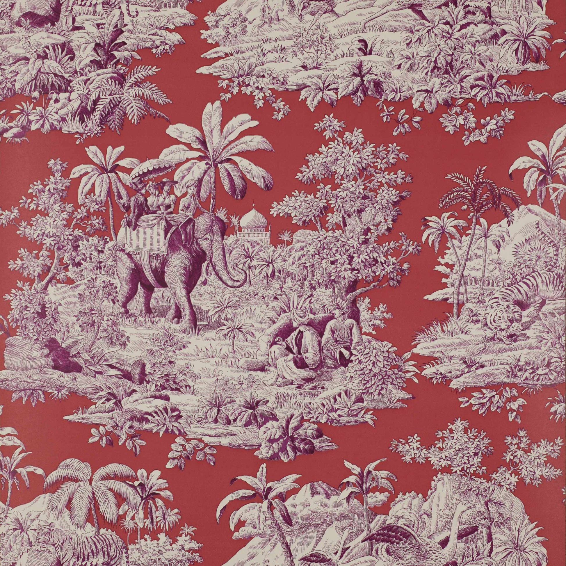 A 19th Century toile design showing an Indian scene in the time of the Raj. Featuring a couple riding on an elephant through a tropical jungle, complete with tigers, ostriches and Moghul palaces. All colours co-ordinate with the fabric ‘Bengale’.