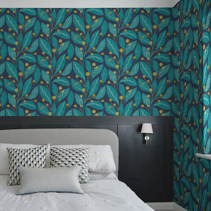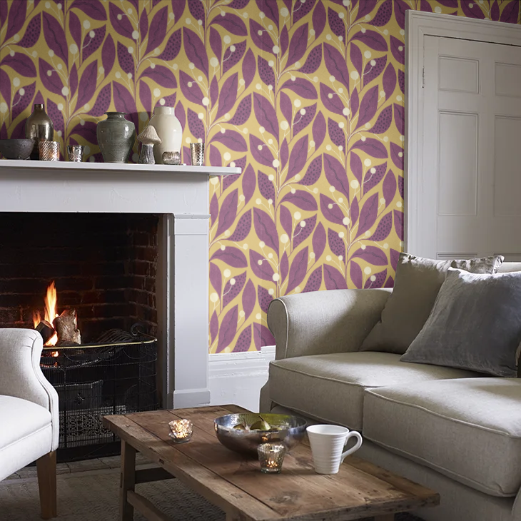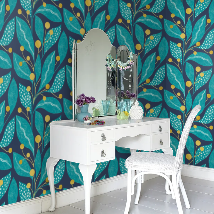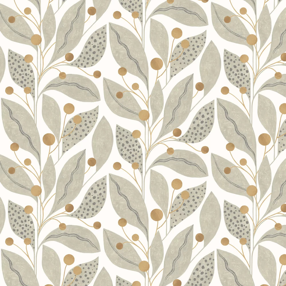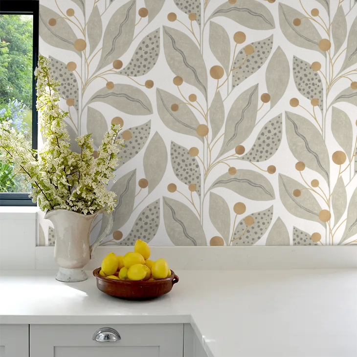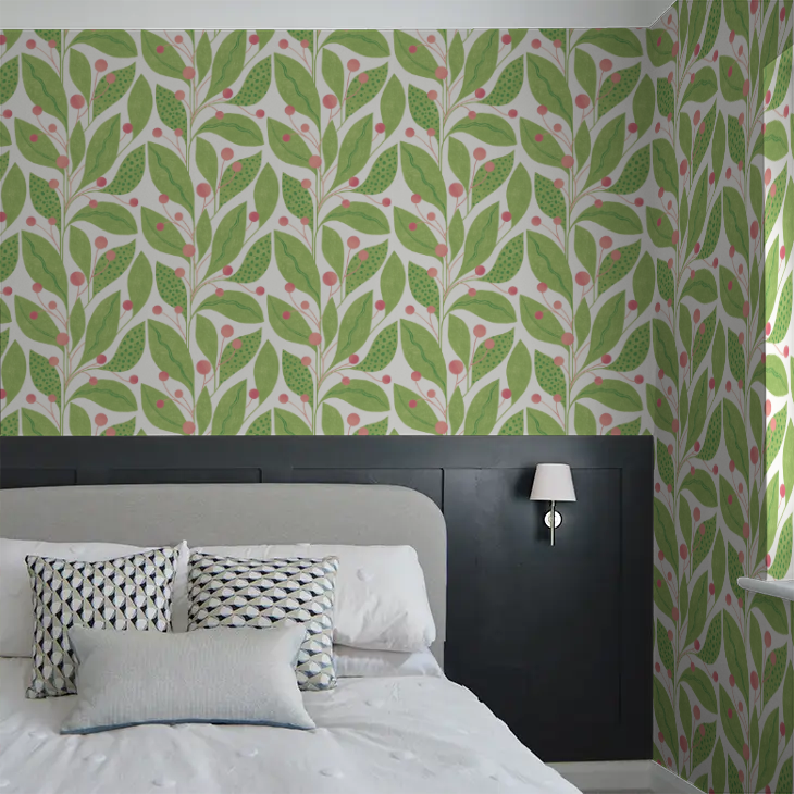 A vibrant wallpaper of repeating stylised leaves, Berry Dot’s branches reach skyward to form a contemporary vertical stripe. Simply drawn and with a painterly texture running throughout, meandering berries add a hint of colour and flow to the design.