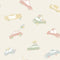 The children's wallpaper Bilarna, translates The cars with a faint pink background is a sweet car wallpaper with older model cars in muted shades of green, blue, oat yellow and blush heading in different directions. The bags are packed and the adventure begins now. On the cars you see cute details such as balloons, flowers, packages and suitcases.