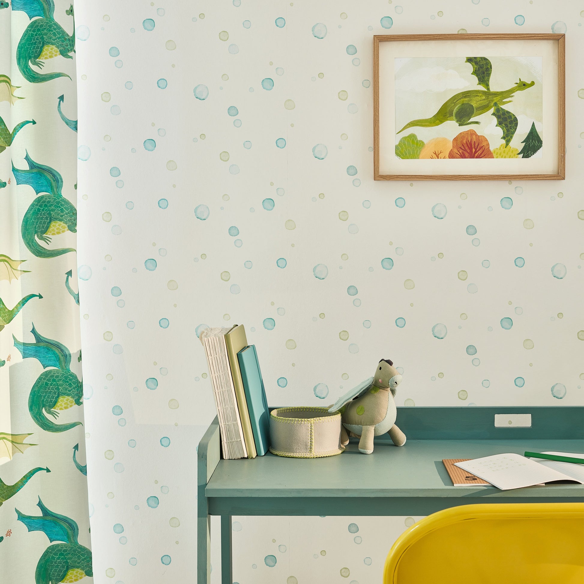 Beautiful coloured bubbles float over this wonderful wallcovering. Each bubble has a soft water colour effect that brings a sense of transparency and fluidity to the design.