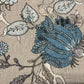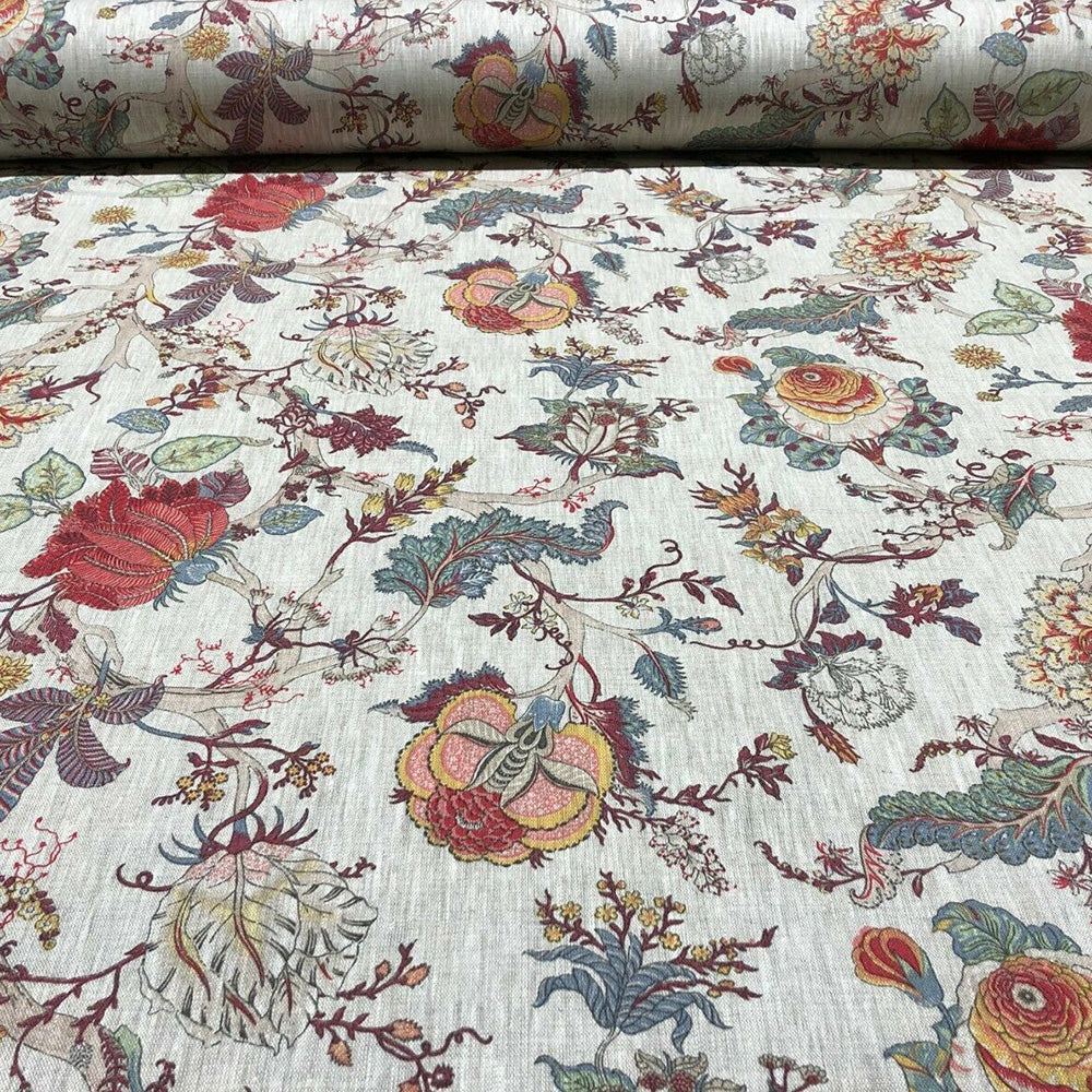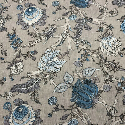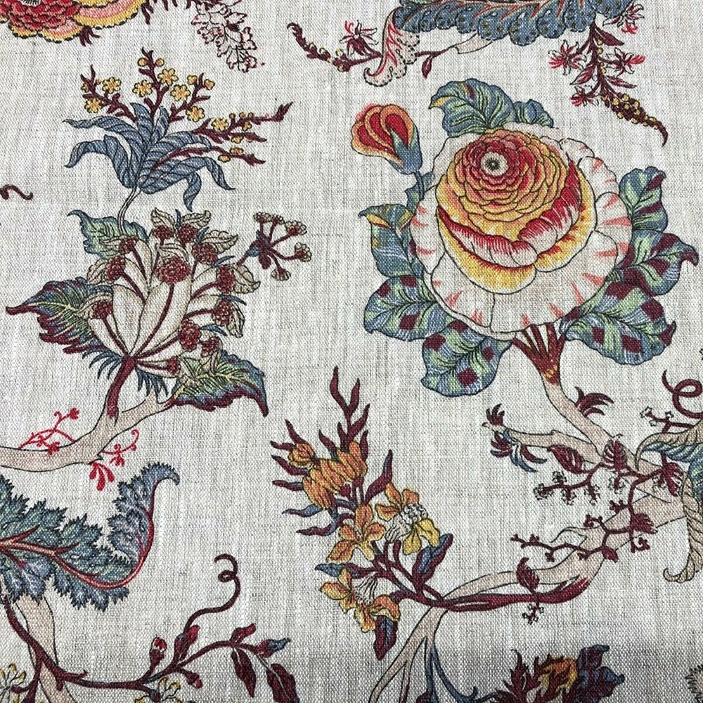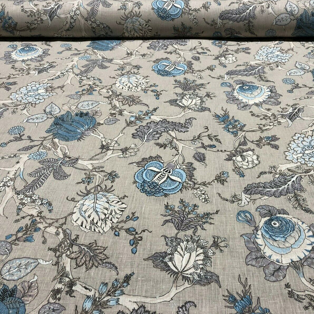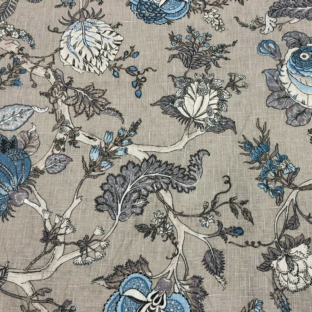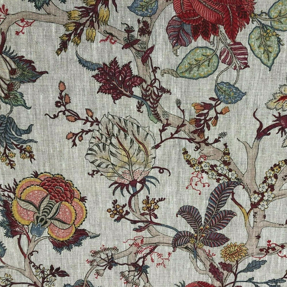 A floral fabric featuring an exotic range of plum and grey hues printed on a luxurious, 100% linen, cloth.