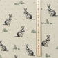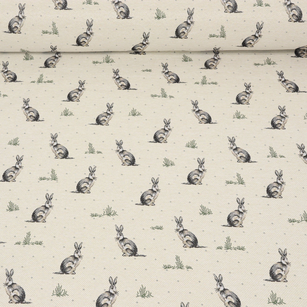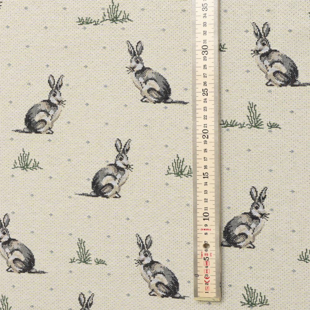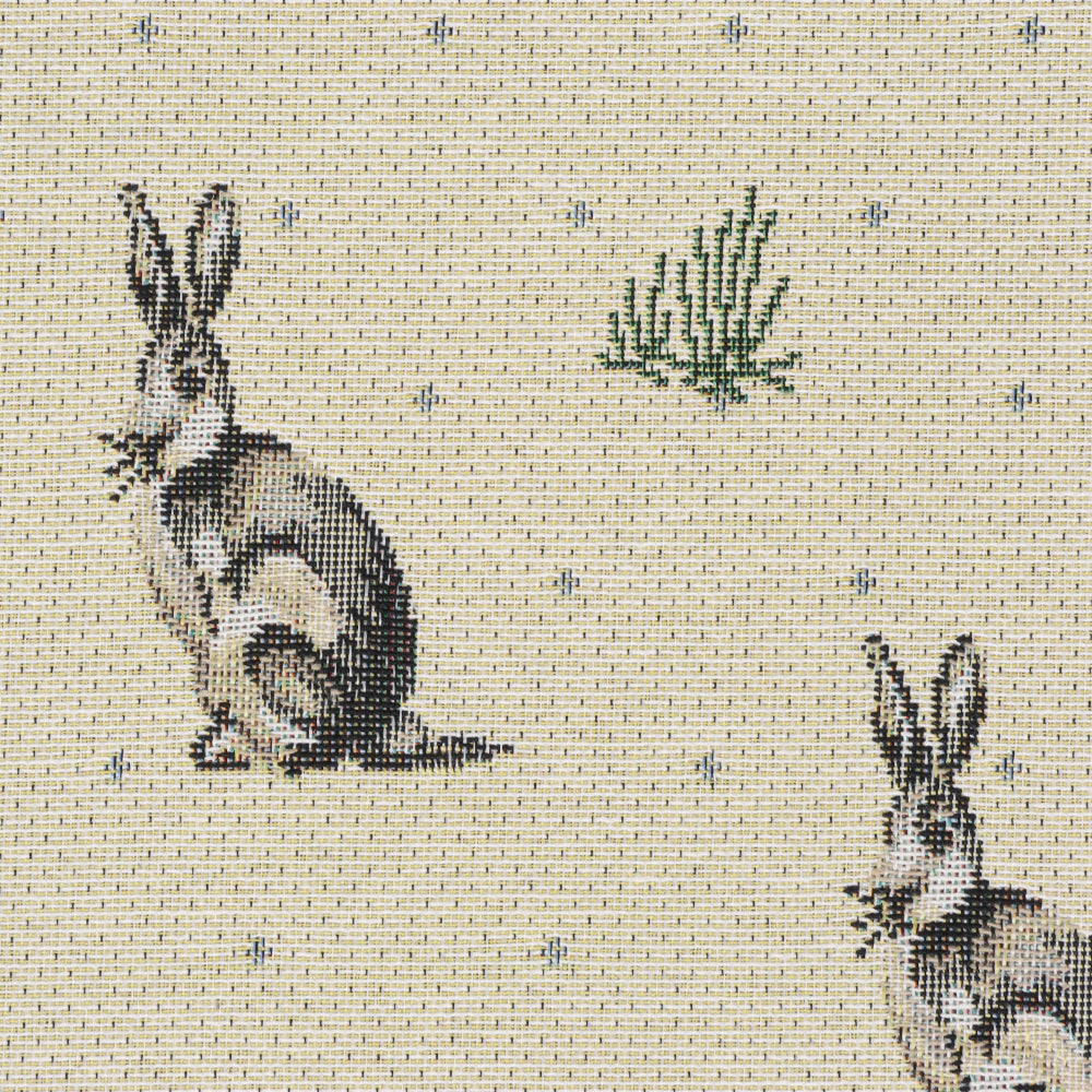 Bunny Meadow Tapestry is a beautifully detailed woven fabric featuring playful rabbits set against a linen coloured back cloth.