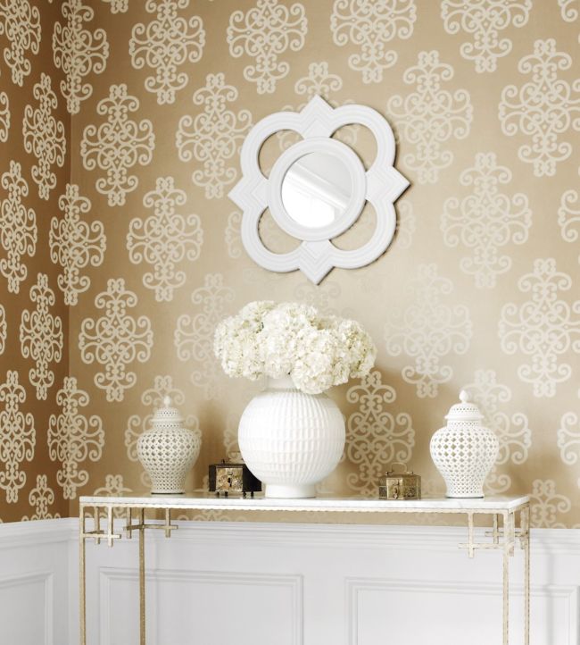 Caballo's large and bold medallions luxuriously scroll with magnifi cent style and grace. An ode to elegant living, the painted pattern has a curvy and chic effect.