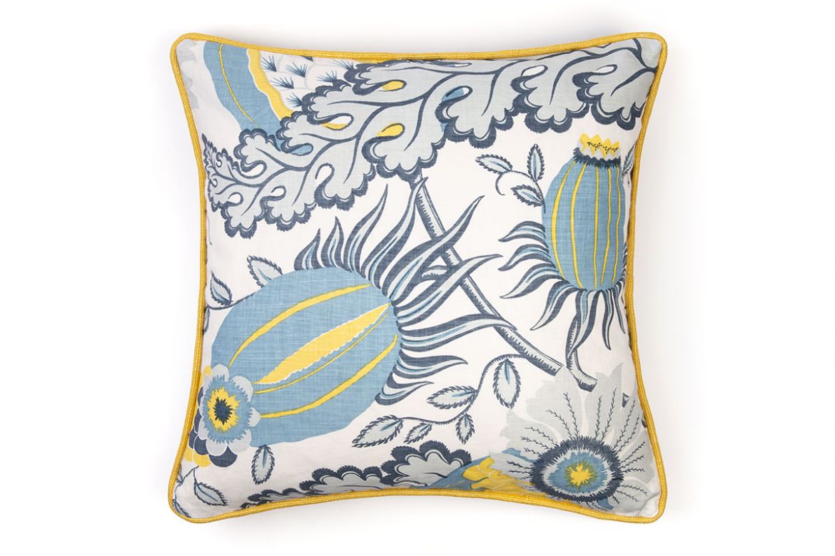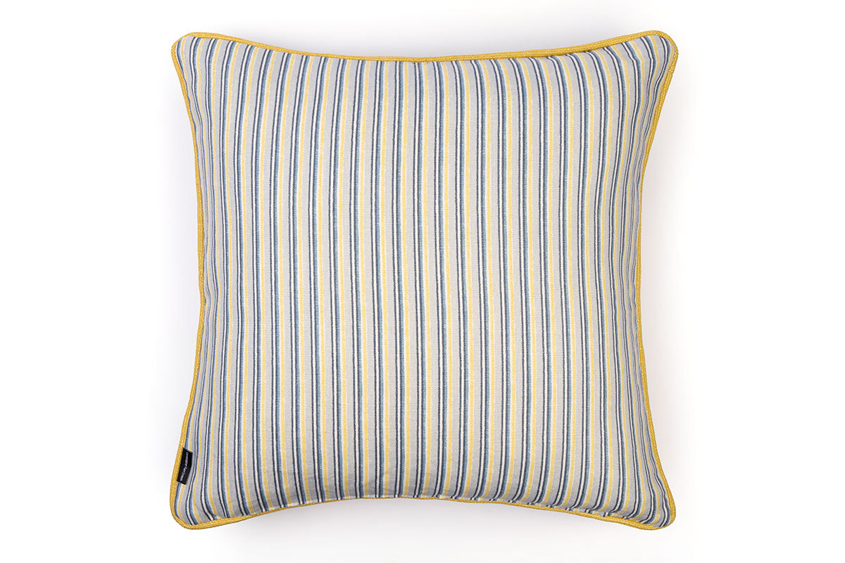 Our best-selling 'Carnival' botanical print from the archives of Michael Szell, combined with the 'Peace & Love' colourful stripe by Kit Kemp, finished with a smart yellow trim. Material: 100% Linen