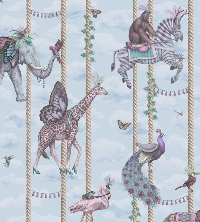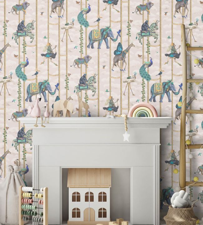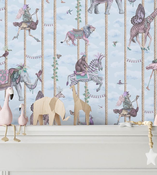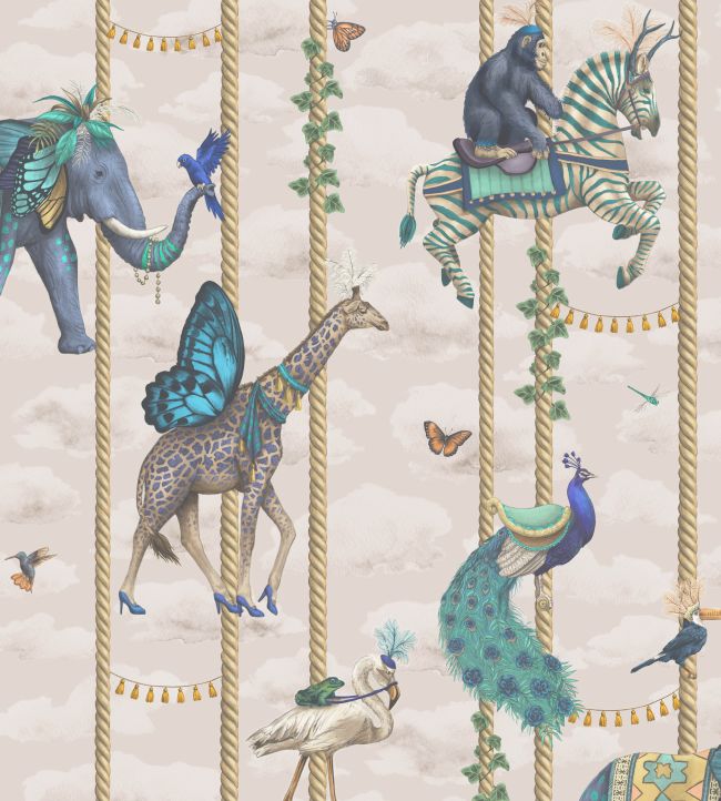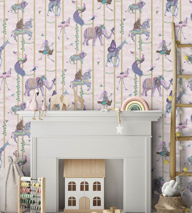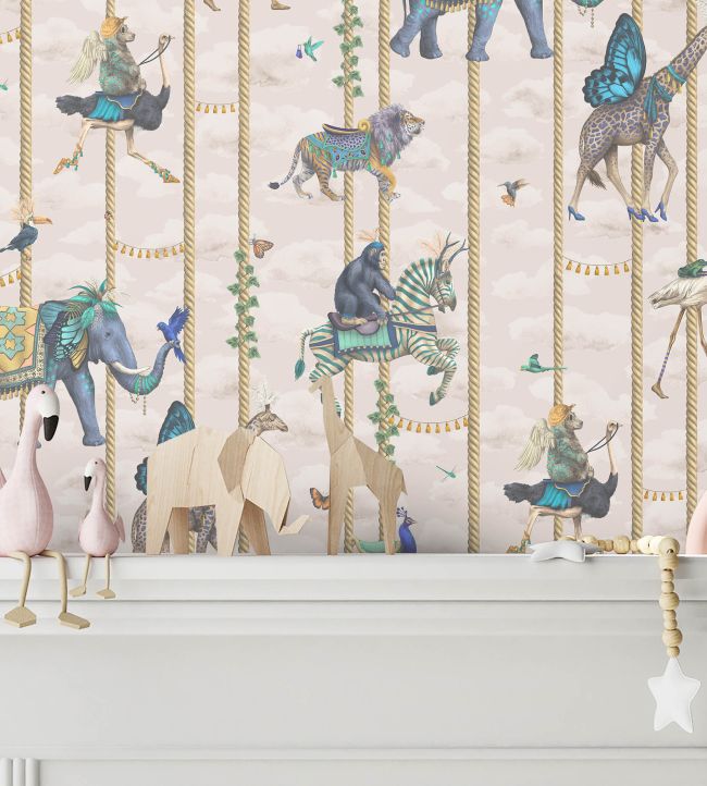 Carousel wallpaper by Brand McKenzie, a stunning design that features a collection of fantastic animals, including a giraffe, elephant, monkey, and zebra, riding around a vibrant carousel. The whimsical and playful design is accentuated by a variety of backgrounds, making it perfect for those looking to add a touch of enchantment to any space.