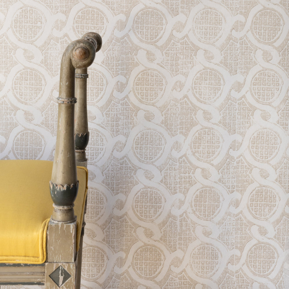 A circular interlinking chain design wallpaper by Peggy Angus.