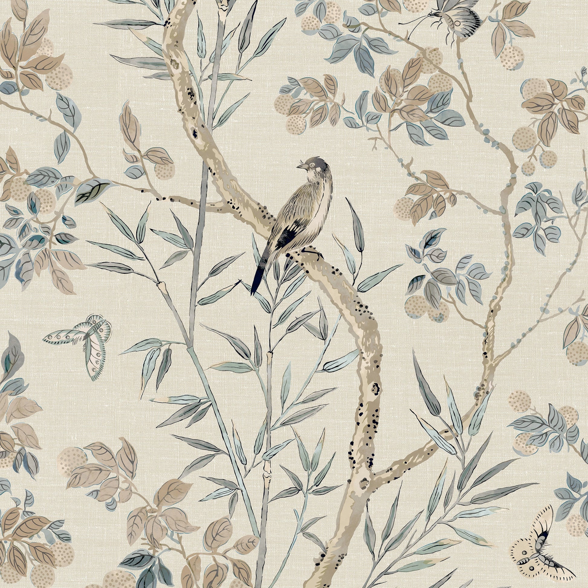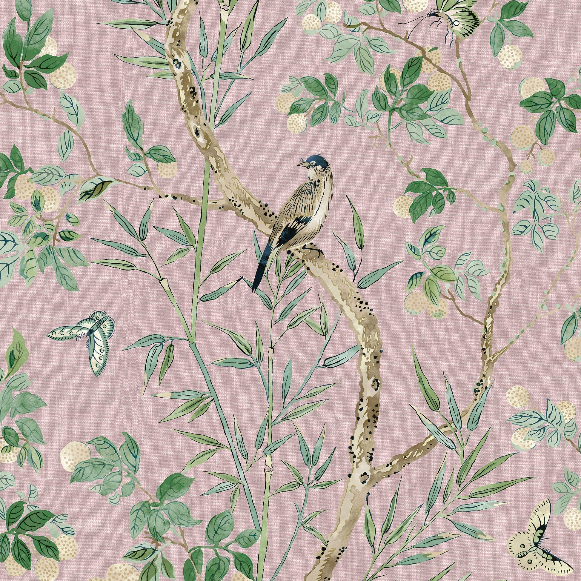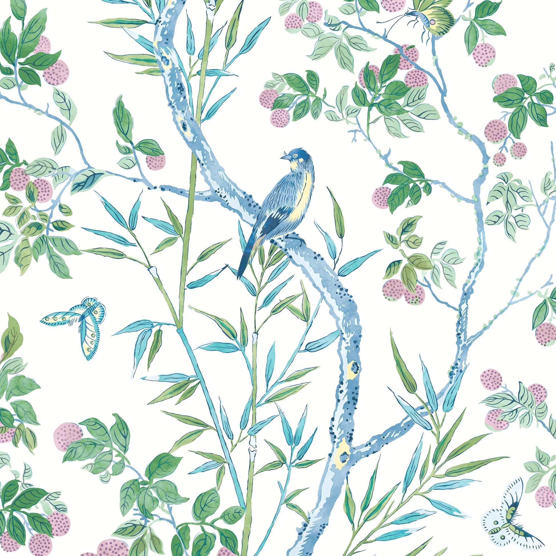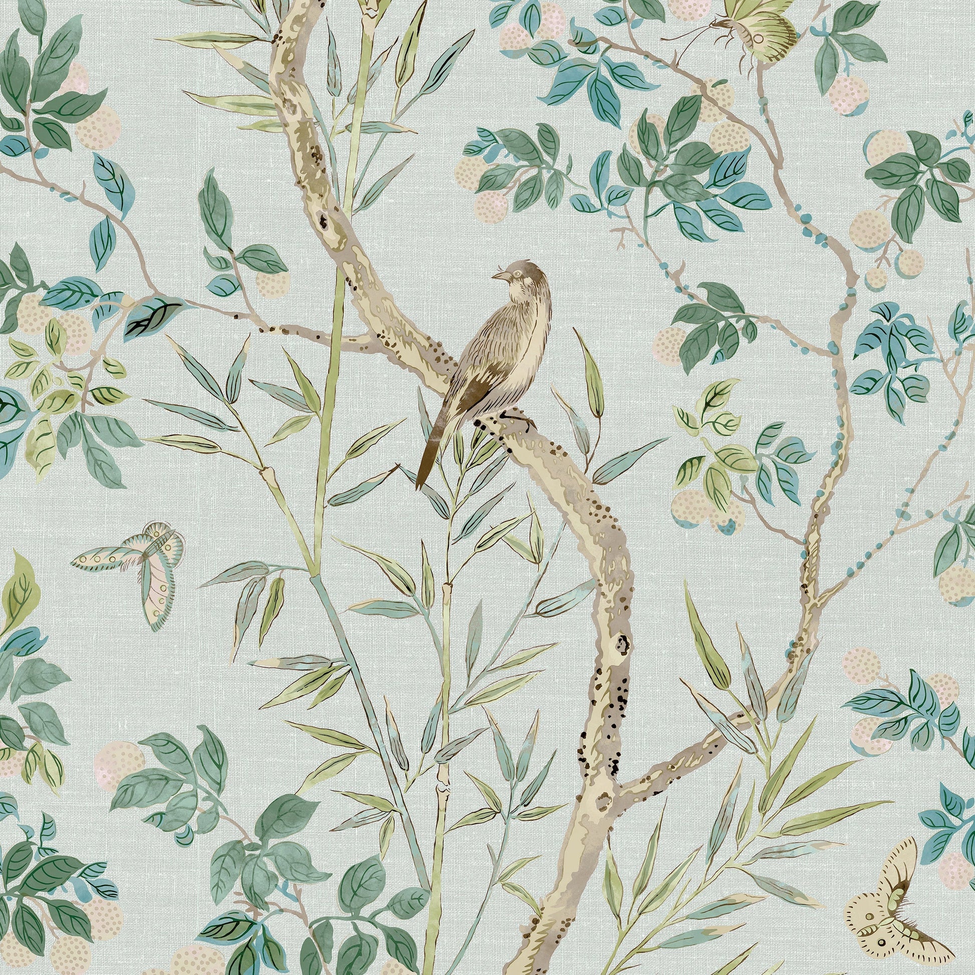 Small birds and butterflies nestle amongst climbing tree branches, delicate bamboo leaves, and lychee fruit. An open and airy design, Claire is an elegant choice in fabric and wallcovering.
