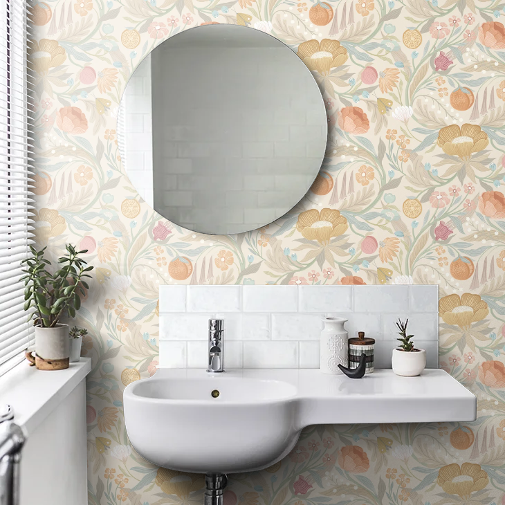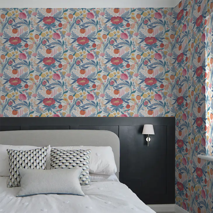 This bold multi-coloured floral design is a modern, joyous take on flowers, fruits, berries and meandering leafy trails. The elements twist and turn in a beautiful ogee design with a hint of art Nouveau styling, it packs a punch and is a vibrant design statement bursting with energy and life.