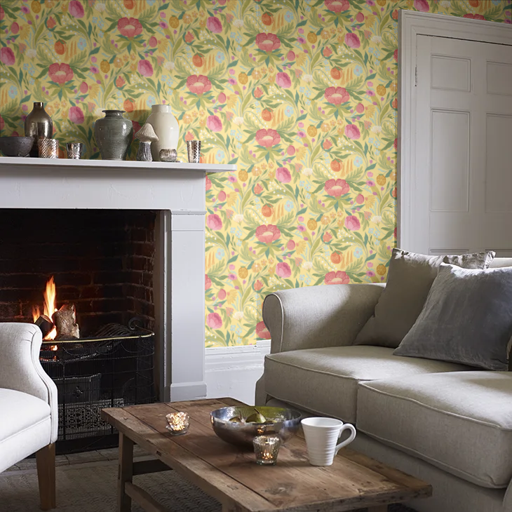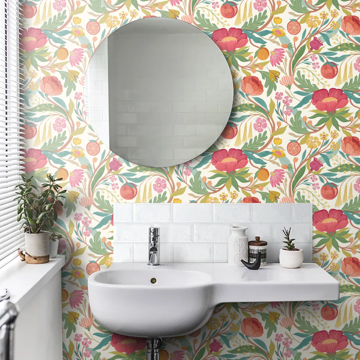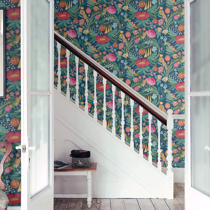This bold multi-coloured floral design is a modern, joyous take on flowers, fruits, berries and meandering leafy trails. The elements twist and turn in a beautiful ogee design with a hint of art Nouveau styling, it packs a punch and is a vibrant design statement bursting with energy and life.
