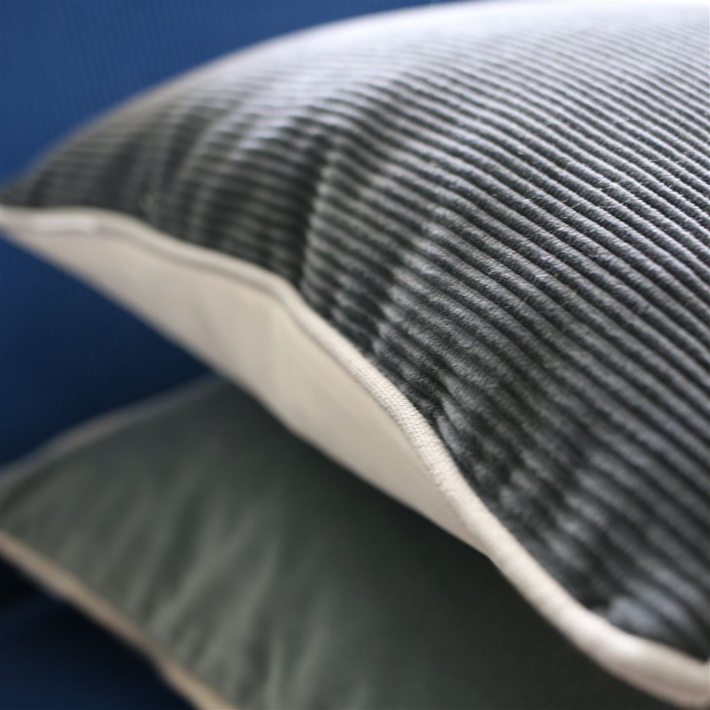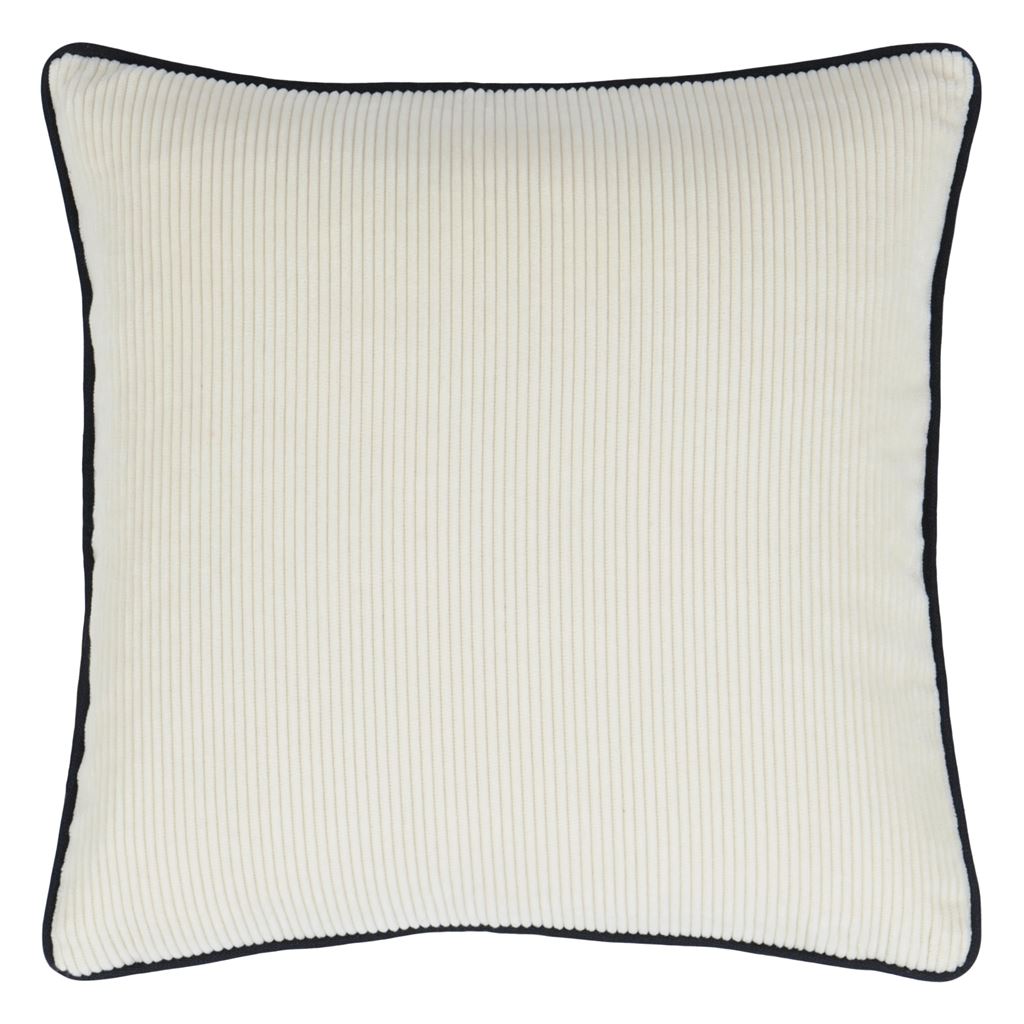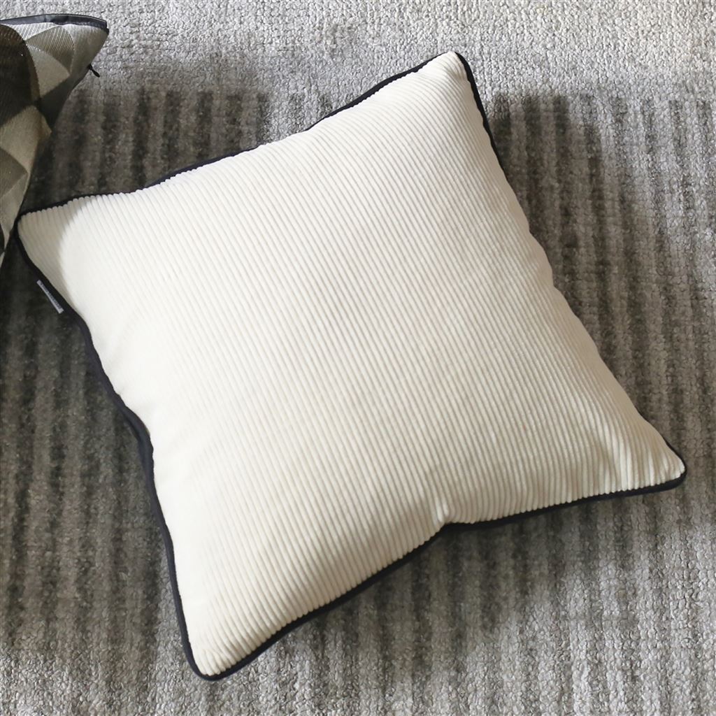 Our new Corda cotton corduroy cushions are the modern staple for every scheme. Soft to the touch in chalk white and coordinated with our Velluto noir plain velvet, this luxurious square cushion is finished with a Scala linen piping detail in noir. All our cushions come with a luxurious feather pad.