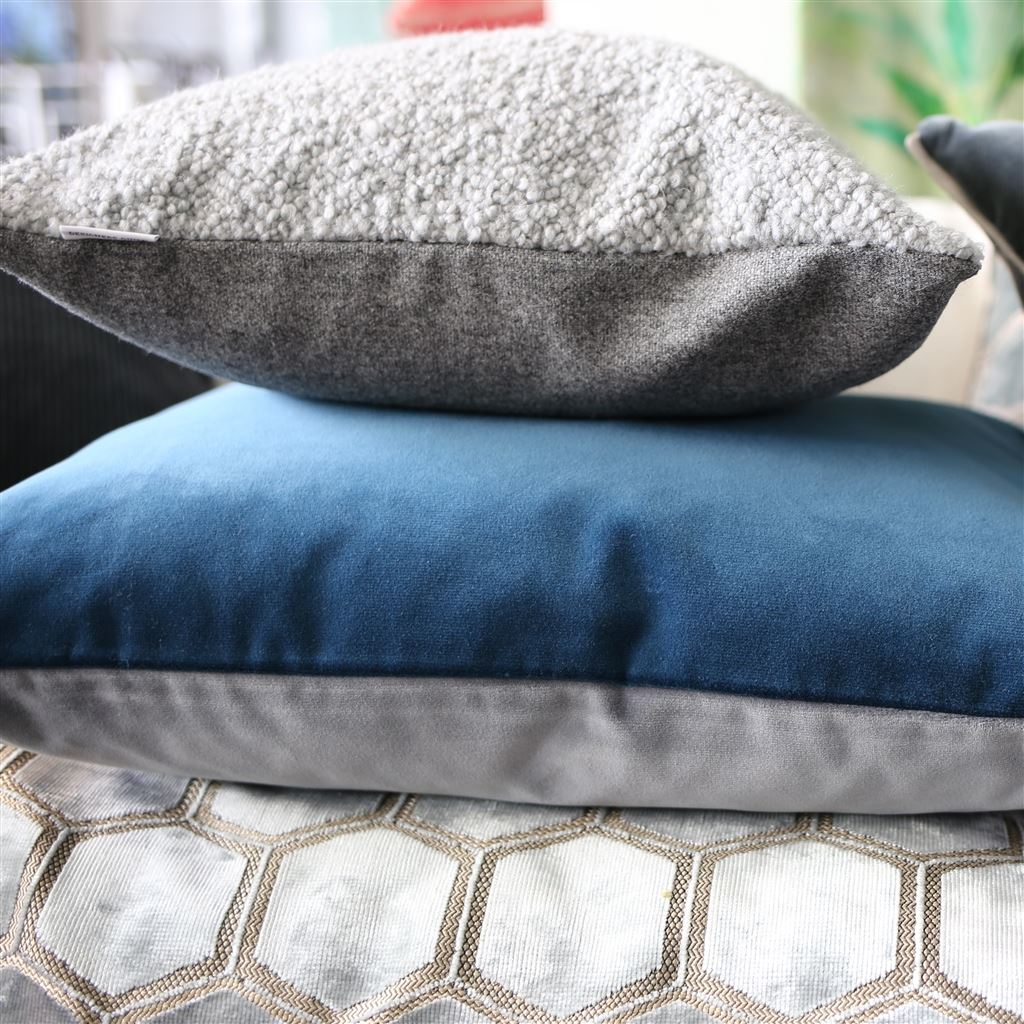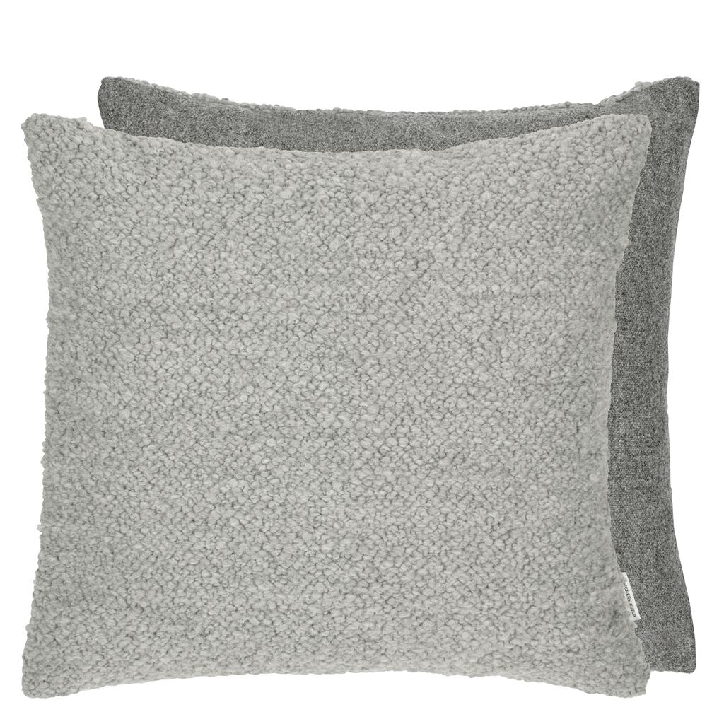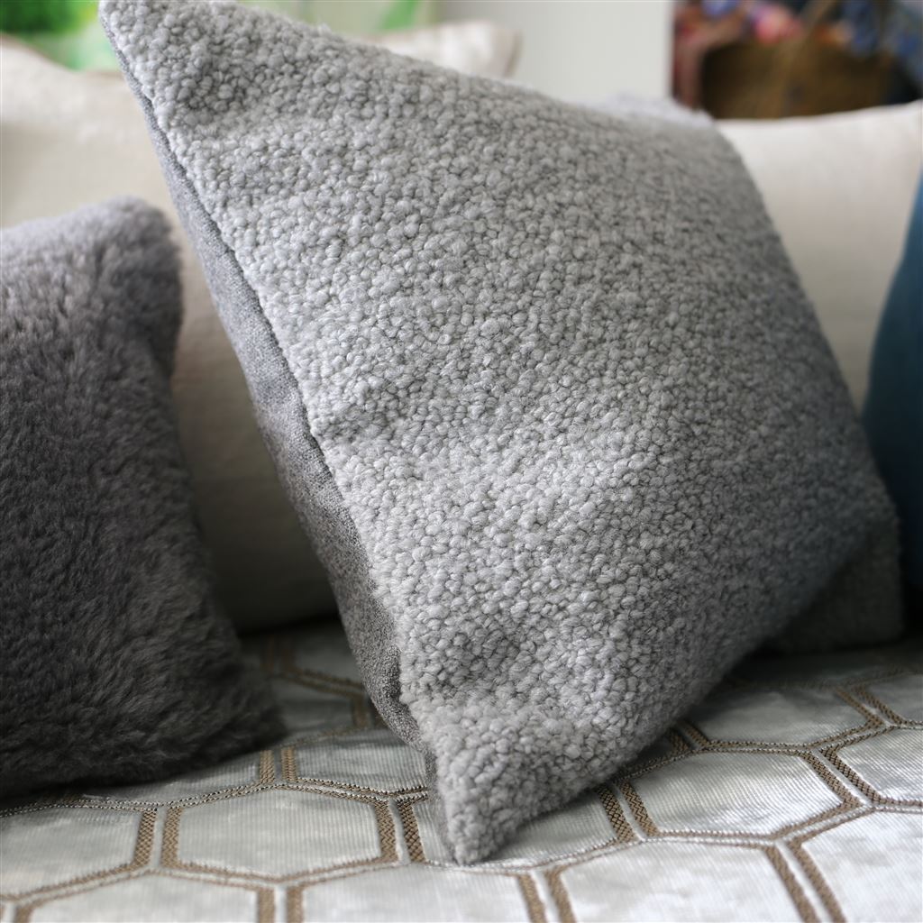 An incredibly soft and fluffy faux sheepskin boucle weave in chalk white is paired with a smart wool cloth in dark charcoal in this stylish square cushion. With it's monochromatic combination this elegant cushion adds depth and texture to your interior space.