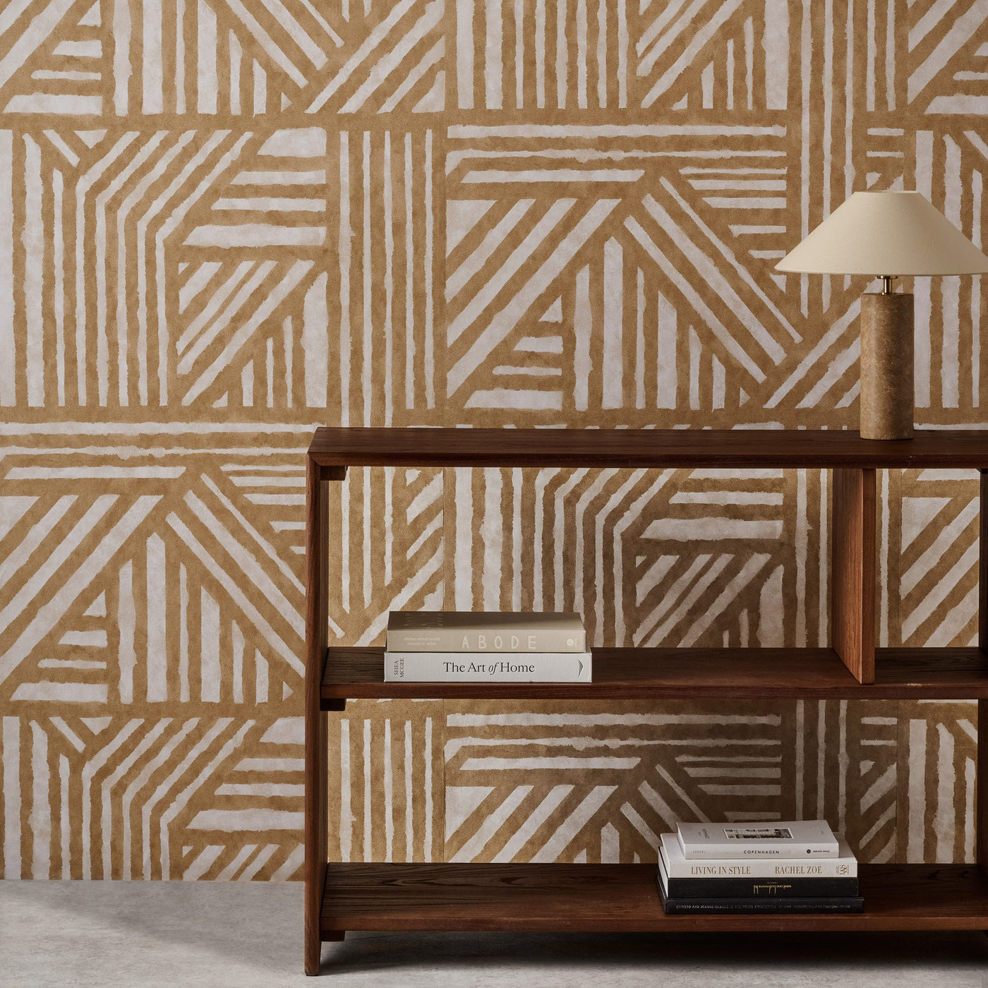 An abstract geometric pattern with parallel lines creating stripes in random directions within blocks. Wide width product.