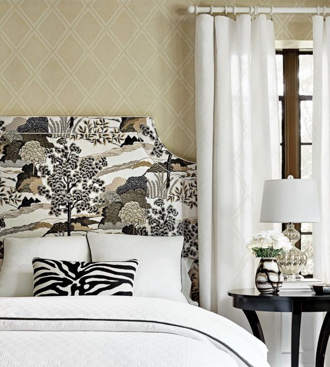 Diamond Head wallpaper was interpreted using gravure printing which captures the fine details of the linen ground with subtly raised white ink to lift the pattern.