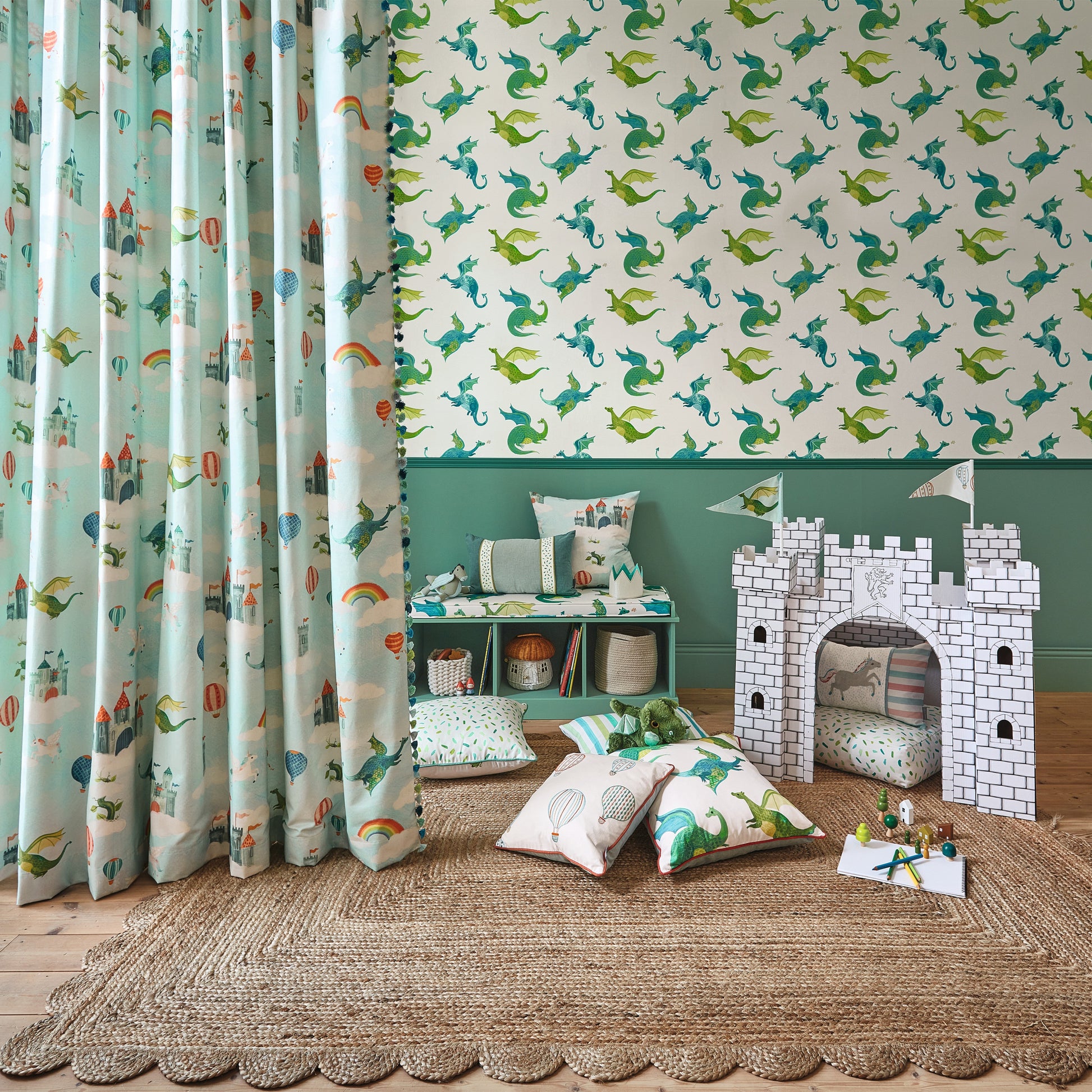 Soaring dragons in vibrant shades of blue, green and aqua, with intricately detailed wings and striking scales, create an exciting wallcovering. Their friendly, playful natures are perfectly captured, offering a magical touch that sparks imagination.