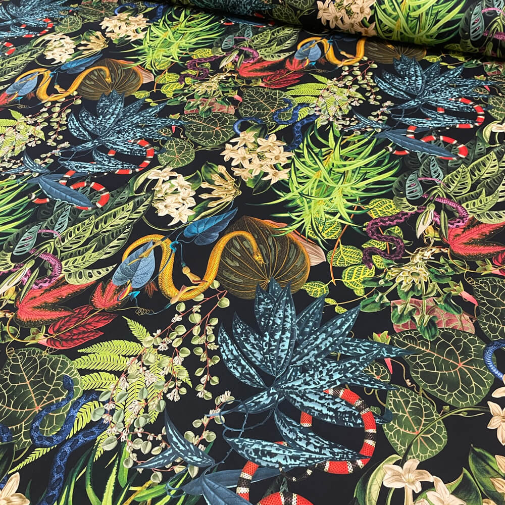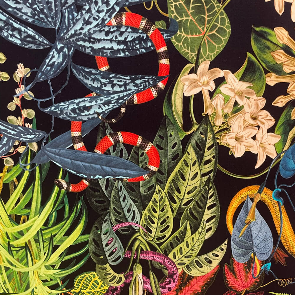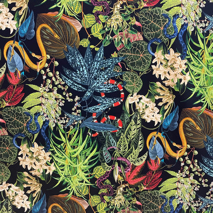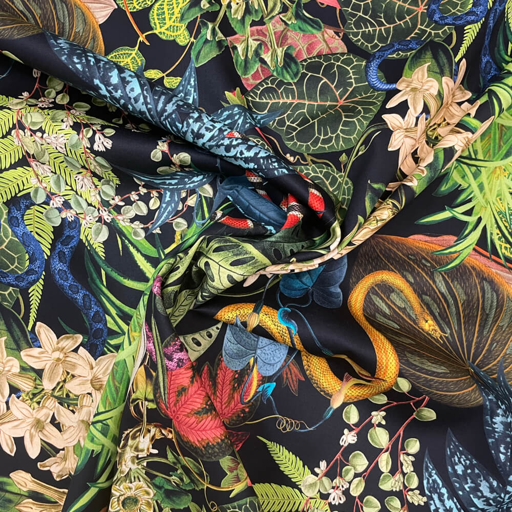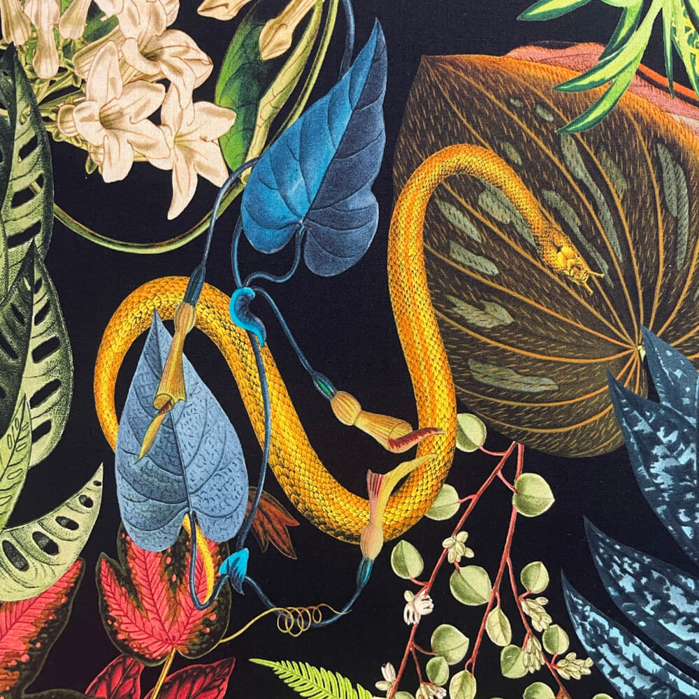 Eden Snakes dazzles with jewel like colours printed in superb quality detail on 100% cotton. Alluring snakes meander through the exotic jungle plants and flowers bursting with stunning colour.