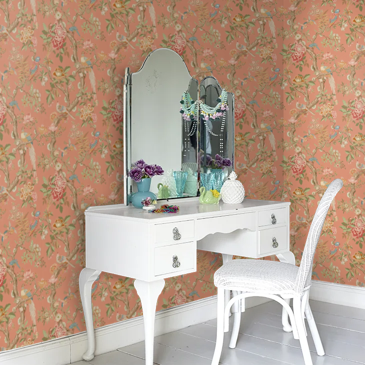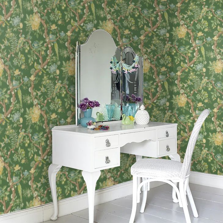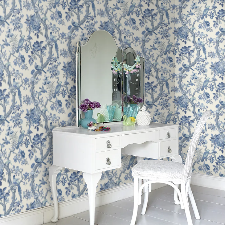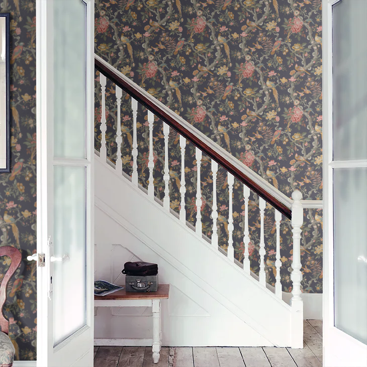 Eltham features a pretty painterly design featuring a variety of birds in leafy branches. Painted in the Arborescent style of flowing trails of flora and fauna with majestic birds.