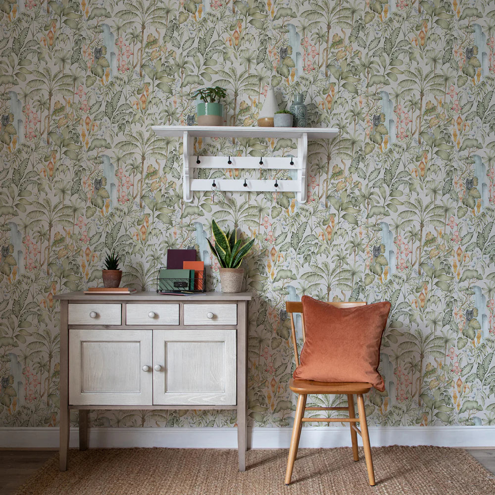 Transform your space into a serene botanical haven with Elysian Canopy Wallpaper. This luxurious, hand-painted watercolour design blends vibrant tropical landscapes with hidden delights—think camouflaged mammals nestled between lush ferns and palms. Digitally printed on non-woven material with a matte finish, the wide-width wallpaper delivers an artistic escape to nature, perfect for those who appreciate both detail and elegance.
