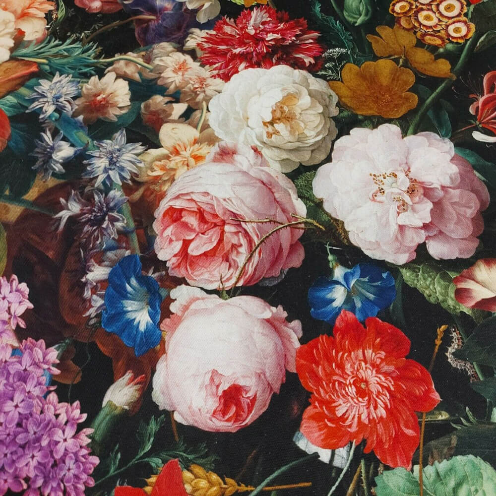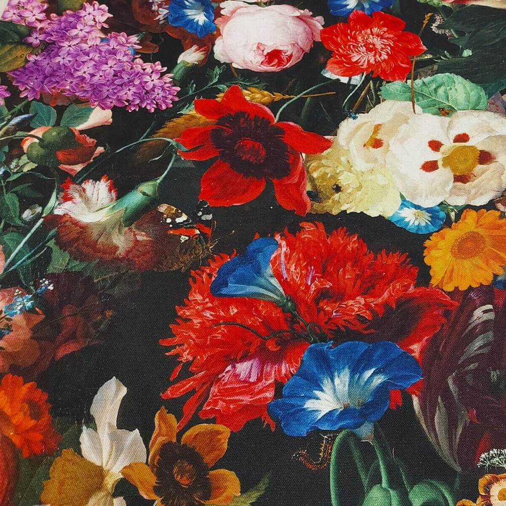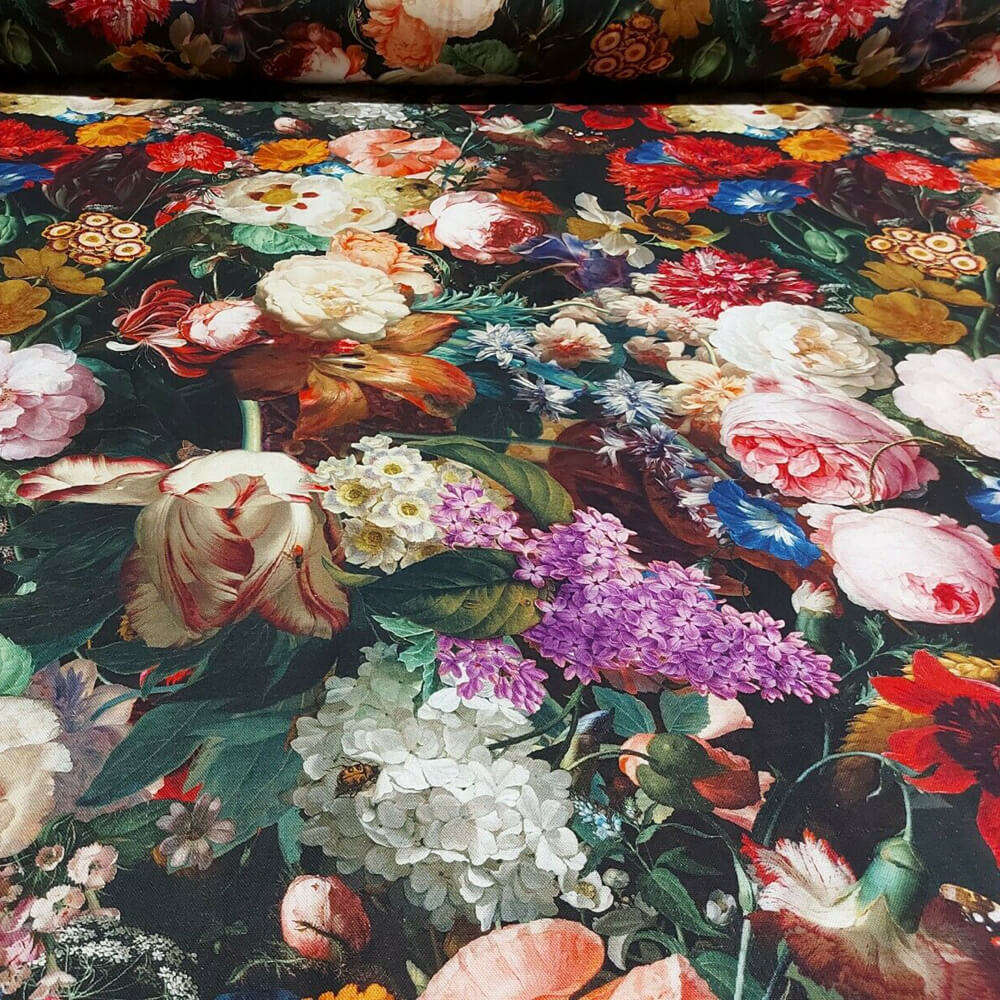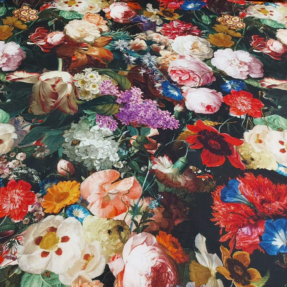 Fantastically floral and reminiscent of an oil painting, English Garden fabric features an abundance of large floral blooms of all colours and varieties. Shadows and sunlight intersperse amongst the stunning hues of this bold pattern.