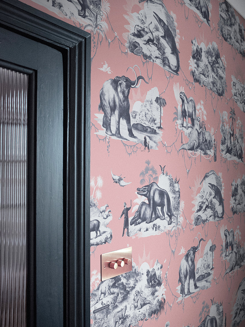 Taking inspiration from Benjamin Waterhouse Hawkin’s elaborate Victorian theme park at Crystal Palace, South-East London. Featuring a plethora of prehistoric beasts as they skulk in the bushes and frolic in the water, you’ll also notice the Victorians of the time as they wander through their Jurassic fantasy world. This detail-rich, largescale wallpaper will bring an artful ambience to any interior.