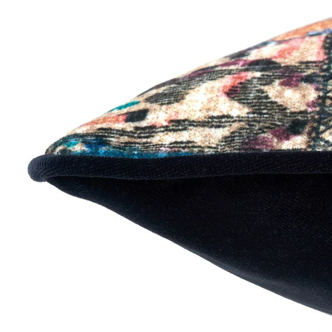 For those who tastes are more classic in flavour, this velvet cushion has an interesting patchwork design based on different carpets from around the world. Vibrant and warm in tone, it's backed and piped in bold Onyx Omega velvet. The cushion is filled with the finest sourced duck feather and down.