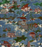 Hover above the mysterious land of ancient Japan with Floating World, a pattern depicting daily village life among majestic curved roofs, tree sprouting fluffy blossom and a backdrop of rugged mountains. Each building or activity is nestled into in opulent gold or moody mid-toned blueclouds for the most enchanting of expeditions.