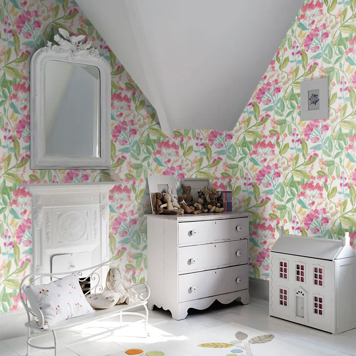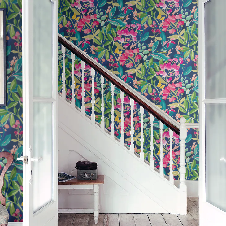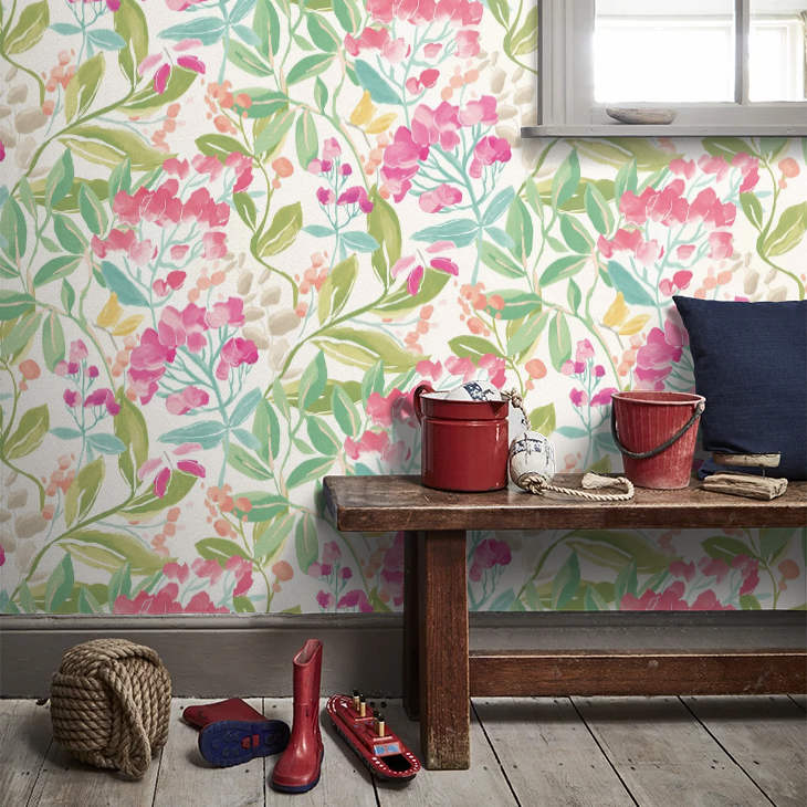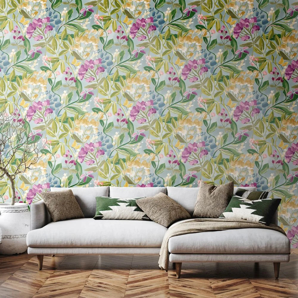 This large-scale, expressive floral allow you to experience the raw beauty of nature through the use of fluid watercolour tones and informal mark making. Pretty petals, berries and leaves overlap and intertwine creating a montage of organic charm to invigorate the senses.
