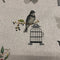A gorgeous linen cloth featuring a variety of birds; broken free from their cages.