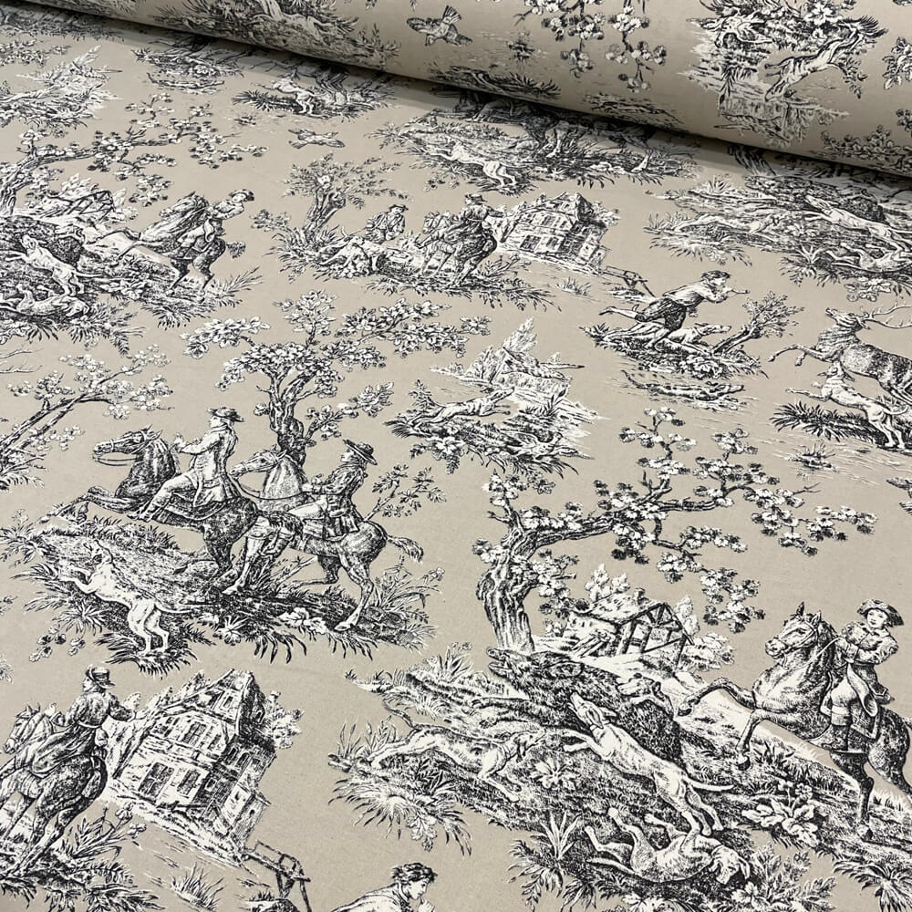 Printed on a high quality 100% cotton that is crisp and durable, Hunting Toile is suitable for curtains, blinds, cushions, soft furnishings and upholstery.