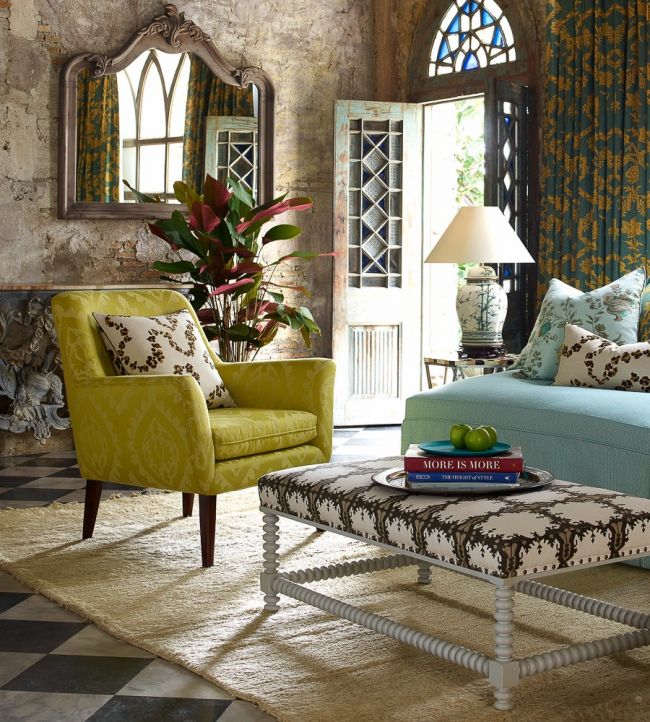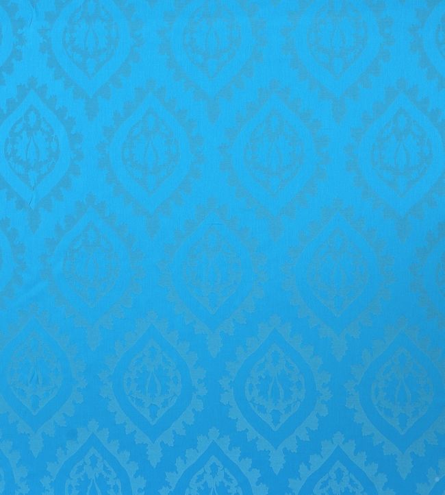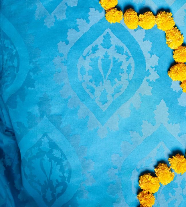 A simple sketch from an Indian miniature of Mughal tents inspired this design. Whilst the linen and cotton yarn construction has all the glamour of a traditional damask, further enhanced by the jewel like colour palette, the simplicity of the ogee motif keeps it sharp and up to date.