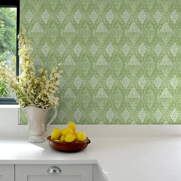 Add chic flare to your space with this bohemian geometric paper, featuring subtle tie-dye detailing in the background.