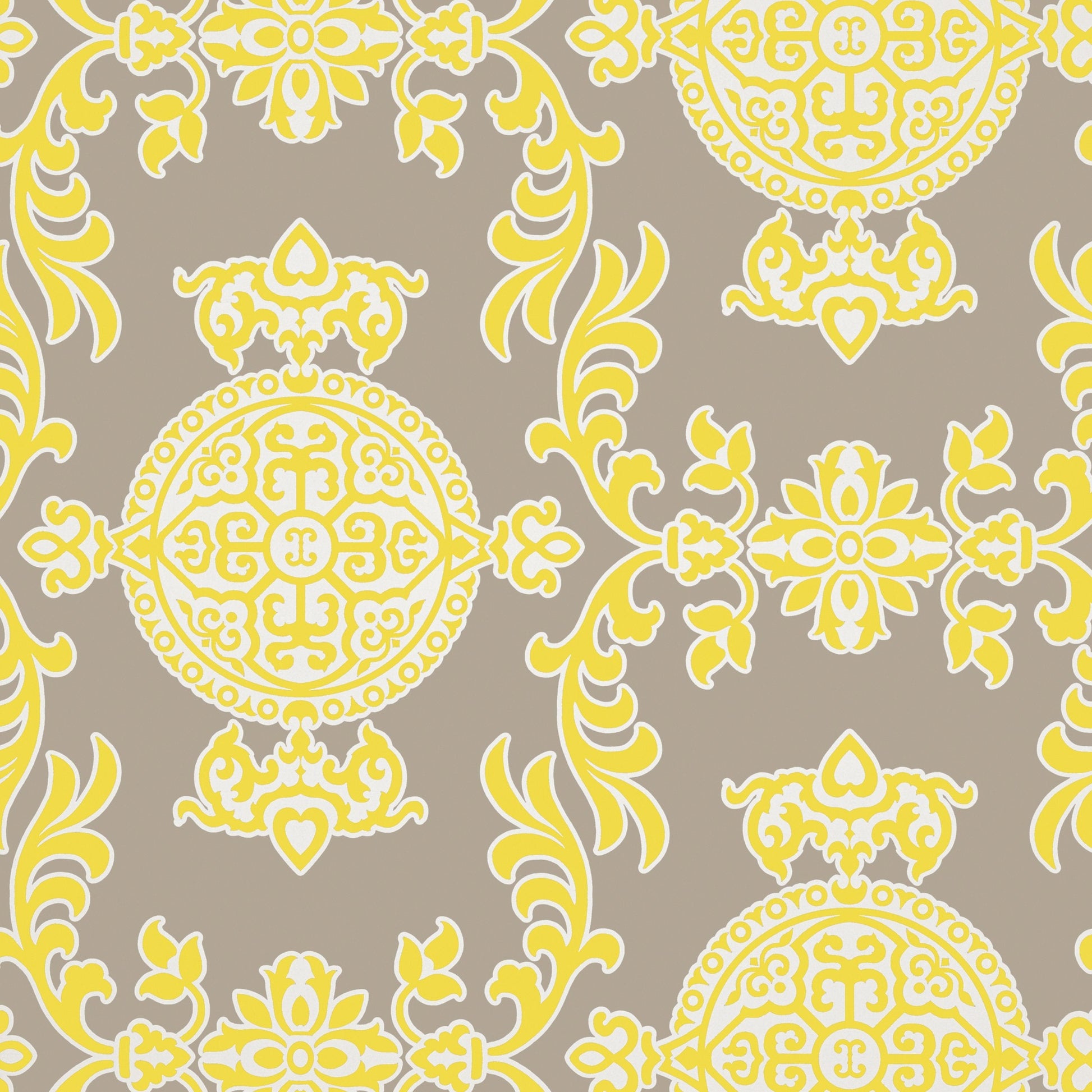 Halie is an exceptionally strong, multi-directional wallpaper with a matching fabric that makes quite the statement with large medallions and graphic appeal.