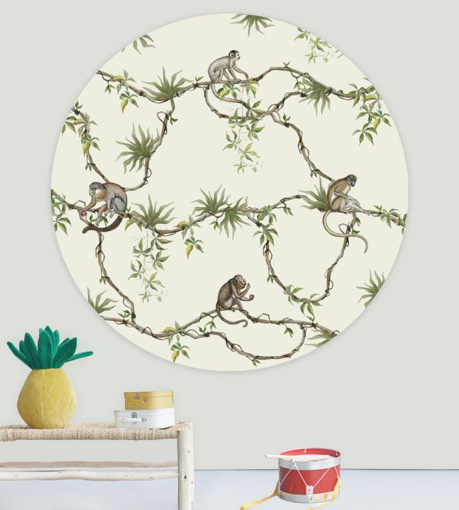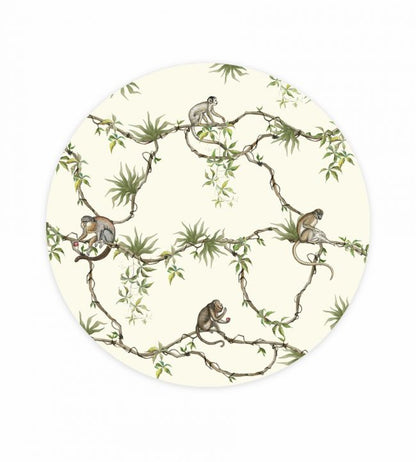 Cheeky monkeys balancing precariously across hanging vines are featured on this circle wall mural in subtle green tones. Printed on non-woven paper.