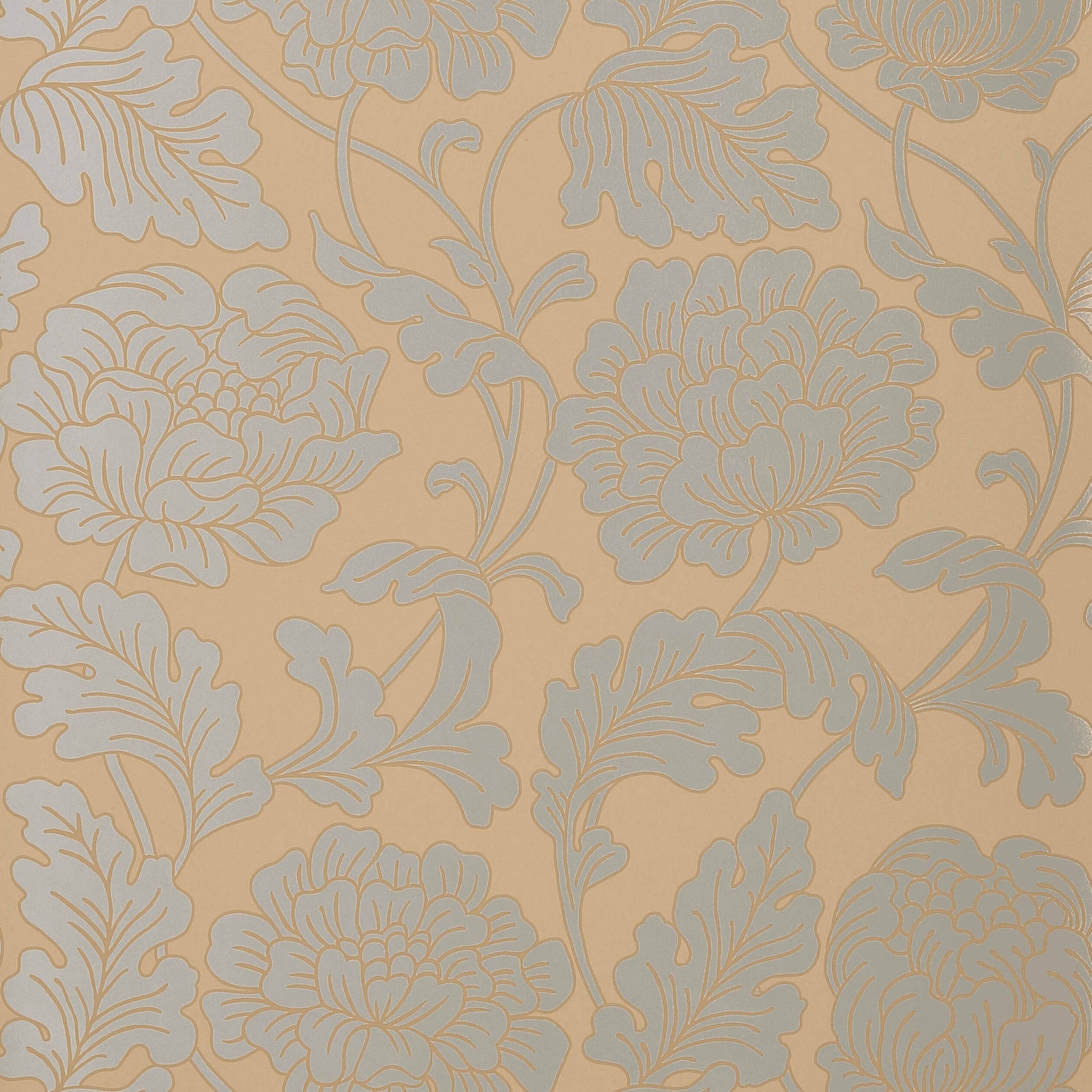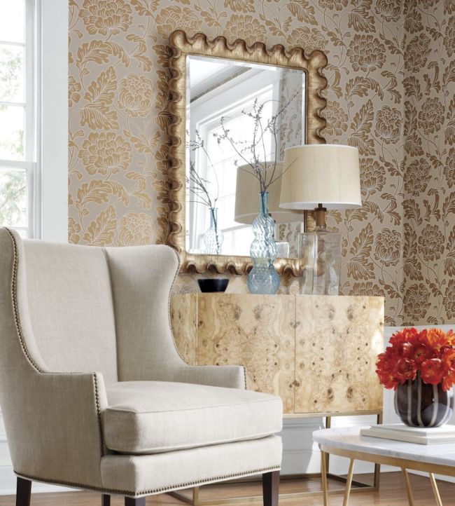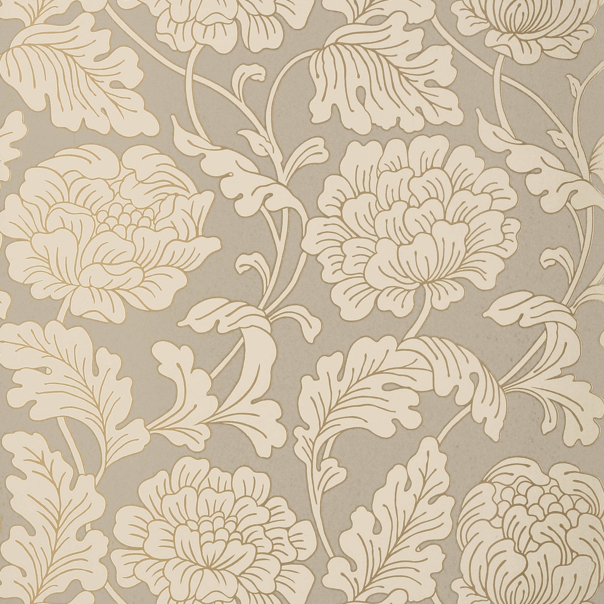 With a hint of art nouveau style, Hathaway's large and blooming floral pattern is beautifully accented with metallic upon a variety of neutral-colored matte backgrounds.