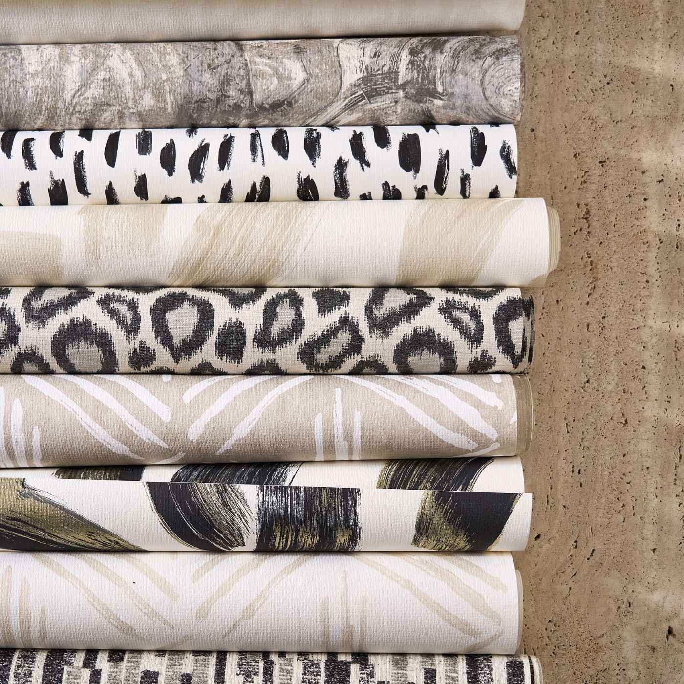 Rhythmic swirls undulate around with dramatic effect with Hatoum. Evoking ideas of agate, marble or rock formations, the design depicts explosive, abstract brush marks, creating a piece of immersive contemporary abstract art - from floor to ceiling. All this is accented when Hatoum catches the light with its mica sheen in Ivory, and metallic finishes in Ink and Slate, for a hint of glamour. With a beautifully tactile hopsack-texture, a soft-raised effect is created, further lending to the overall impression of the design as a display of wild, circular, organic forms.