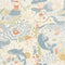 Wonderful children's wallpaper Havet, translates The sea, takes you and your child on a fantastic journey of discovery. A detailed pattern in shades of blue grey, coral, mustard yellow, beige and olive green creates a story unfolding on a white background. Among marine creatures such as whales, octopuses, clams, jellyfish and shells, large ships and small boats travel, guided by the reliable light of the lighthouse. Night turns to day on our journey across miles of sea.